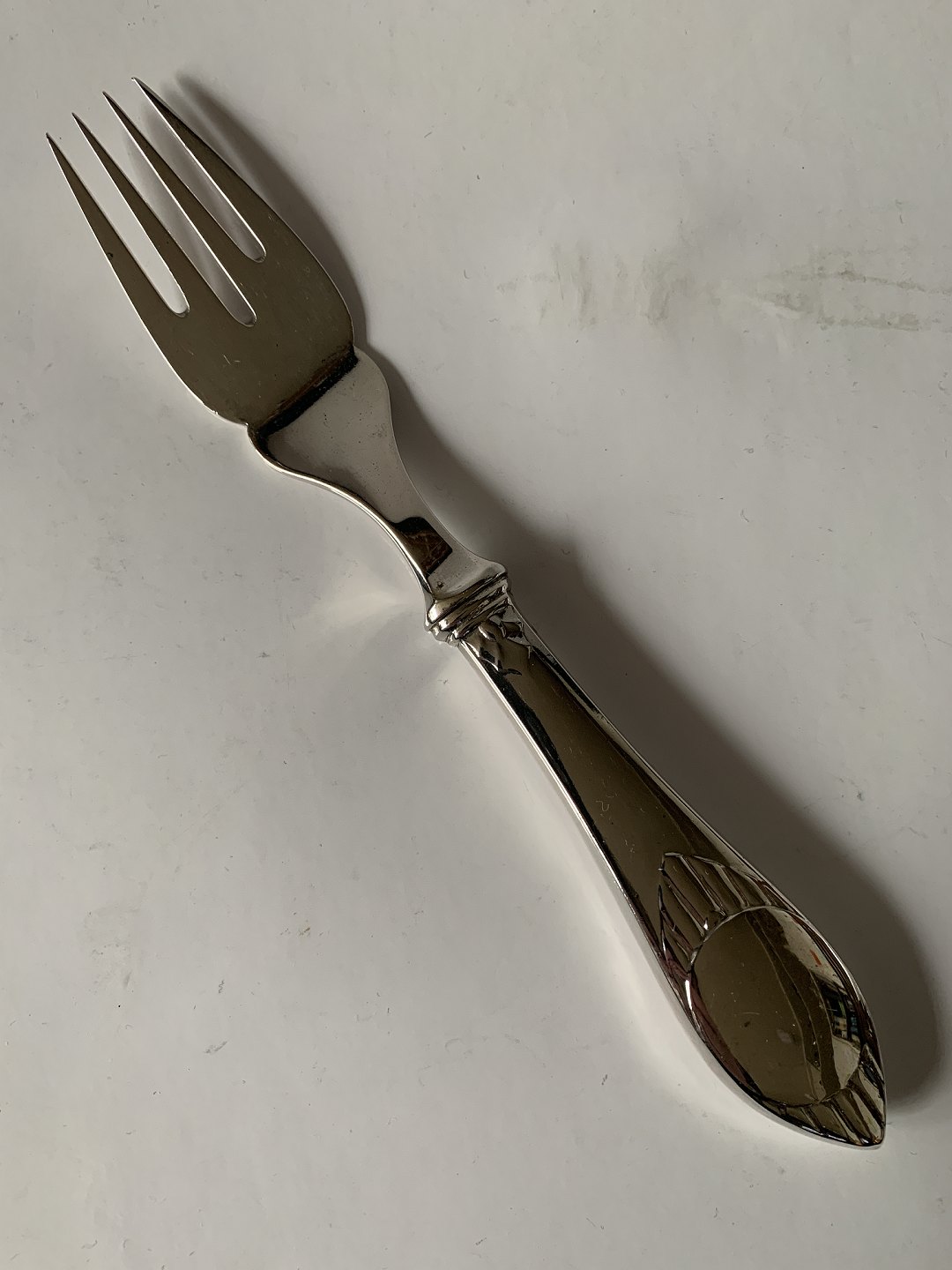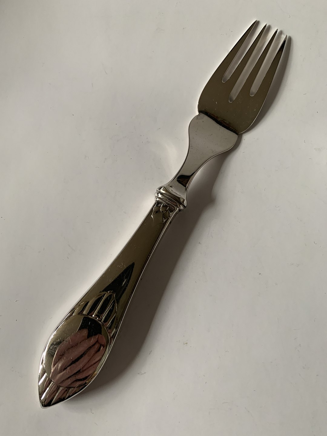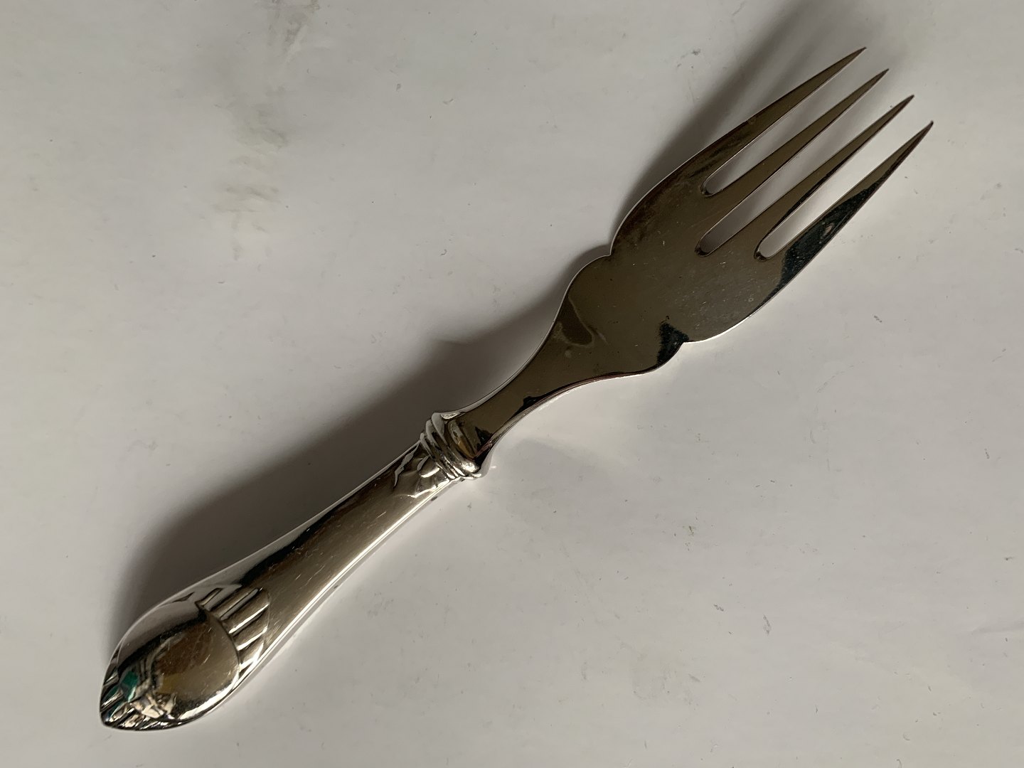 Træske Fiskegaffel Sølv. Stemplet. Tre tårne. Længde 18,4 cm. Brugt og velholdt. Alt bestik er pudset og pakke i pose