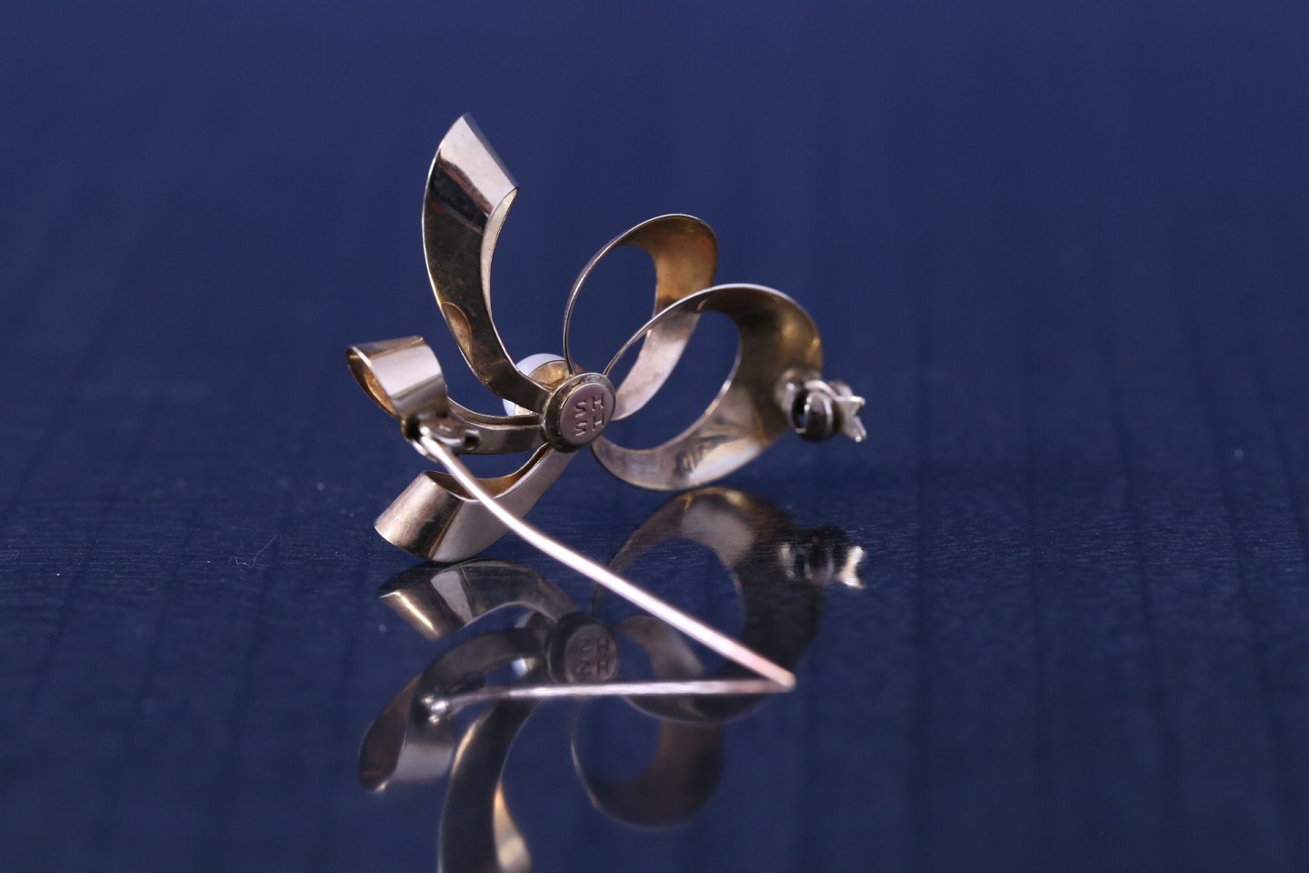 Smuk guldbroche med bløde linjer i 14 karat guld, med ægte perle.
