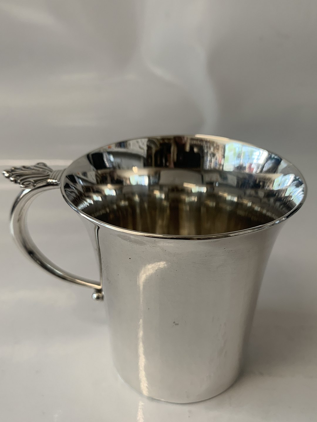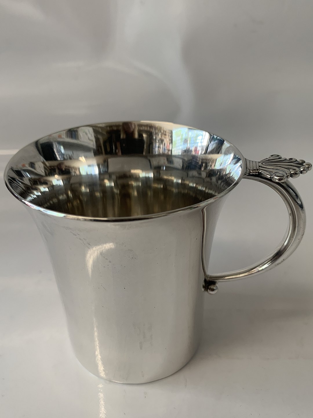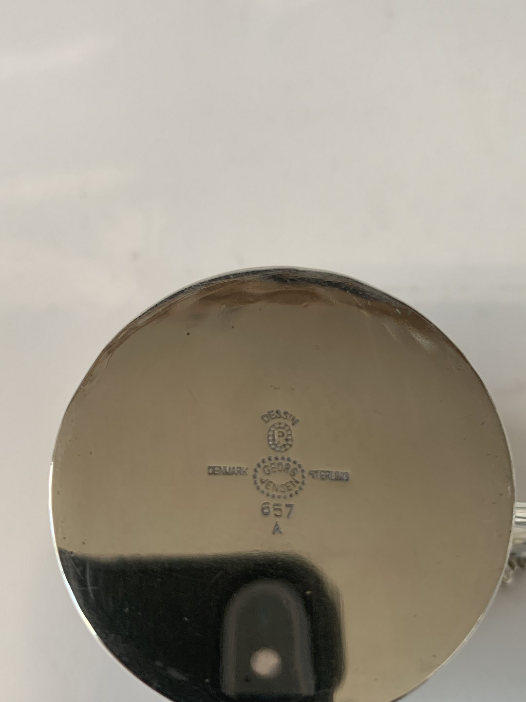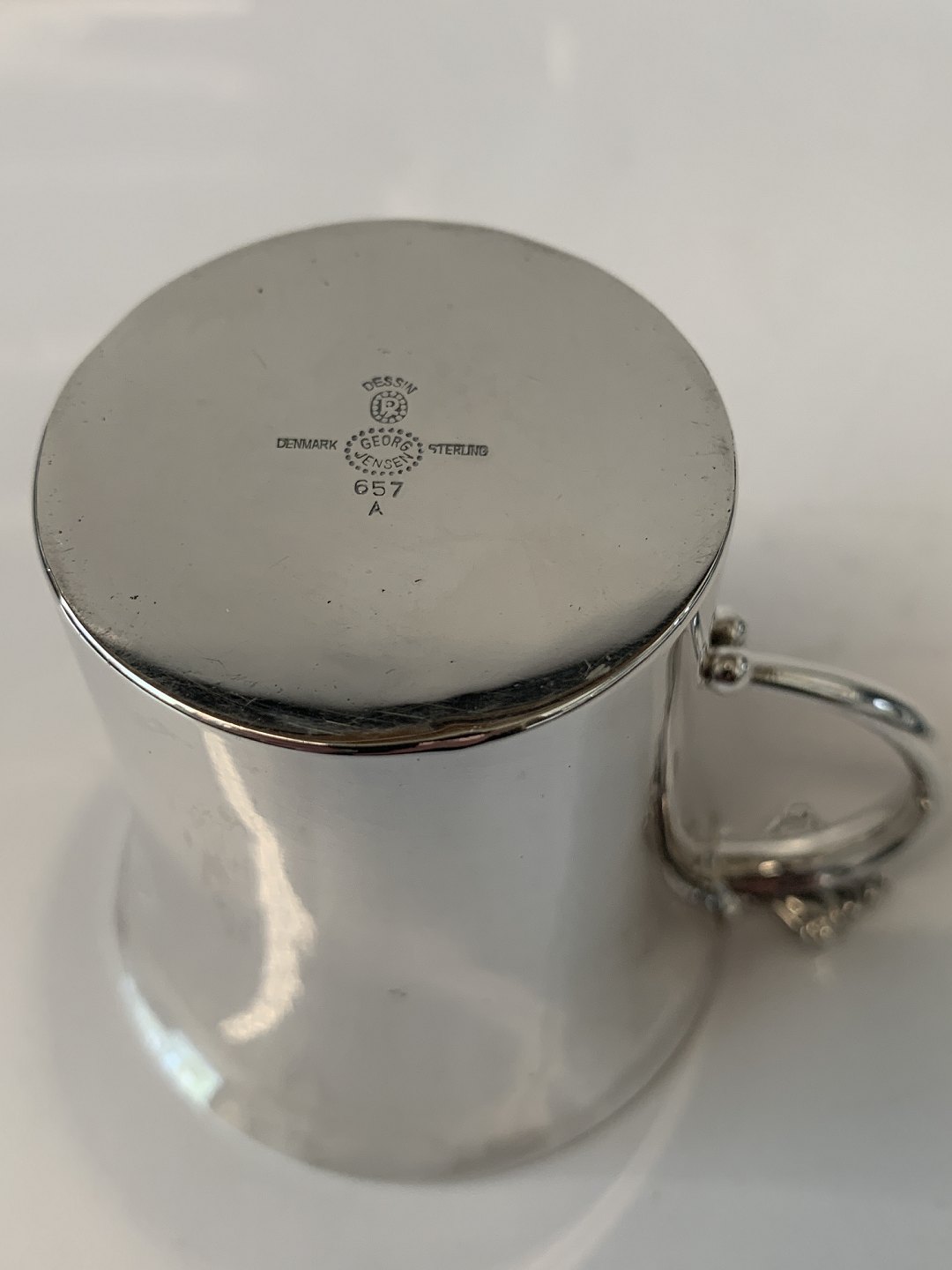 Dronning / Acanthus, Georg Jensen Barnekop Sterlingsølv. Designed by Johan Rhode Stemplet: Georg Jensen, Sterling Denmark Nummer / Nr. 657 A. Højde 6,8 cm. Diameter 6,6 cm. Flot og velholdt stand