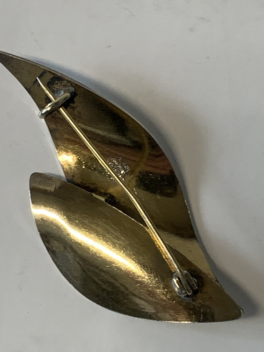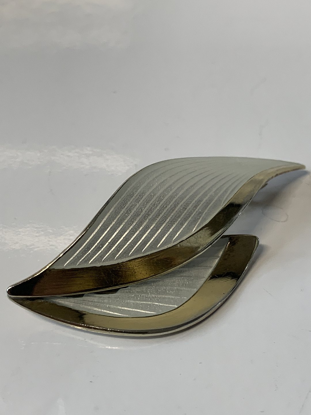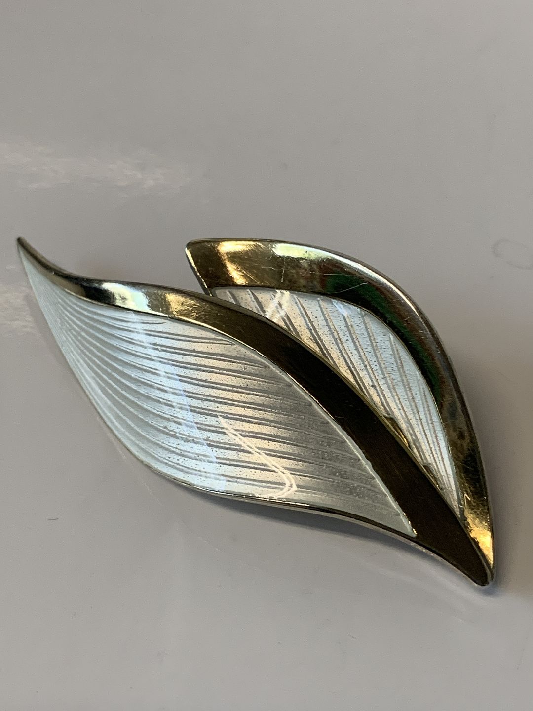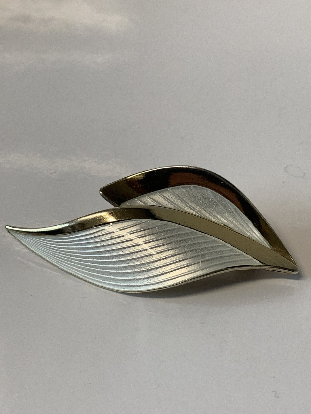 Beautiful brooch shaped like two leaves, coated with white enamel. The soft lines give the brooch an organic look that brings the brooch to life. On each leaf are lines that enhance the leaf shape and at the same time provide contrast in the enamel. This brooch is very beautiful, and will be especially suitable for dark colors. Wear it with a nice dress or blouse, and you will definitely be the center of the party.