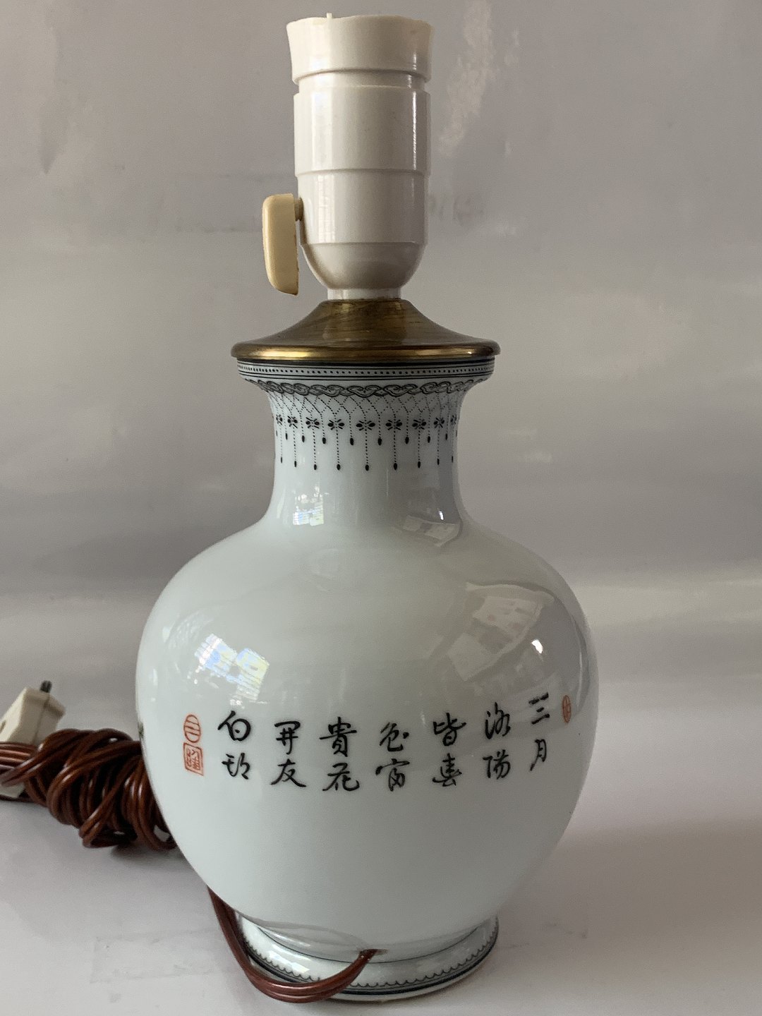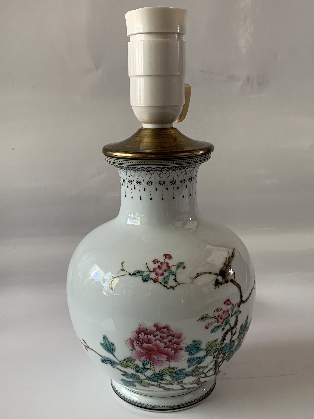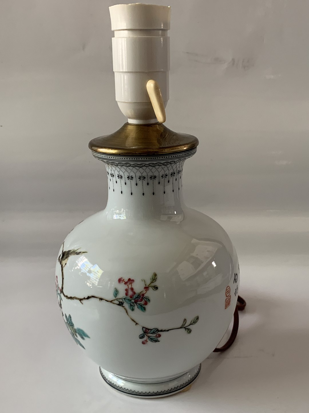 Chinese table lamp in porcelain with brass top and socket with bird and flower motif. Stamped on the bottom. Height with socket 26 cm. Height without socket 19 cm. Well maintained condition.