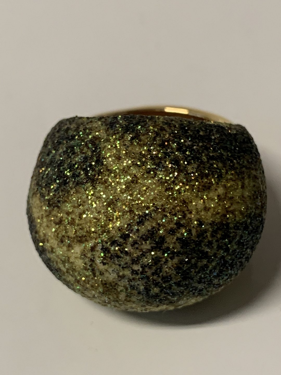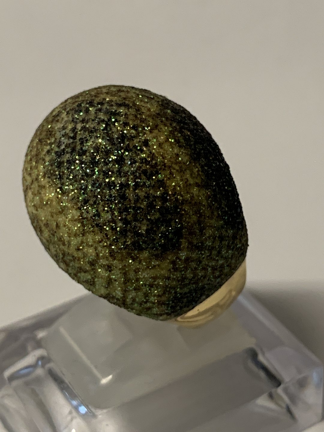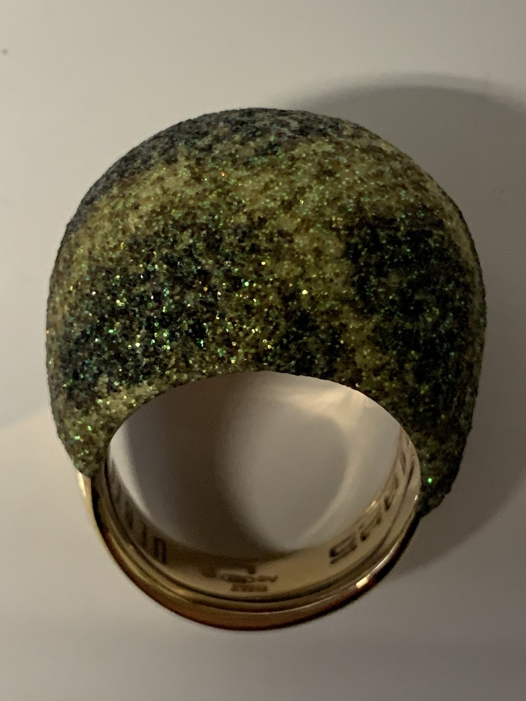 Statement ring i forgyldt sterlingsølv med grønne stene.