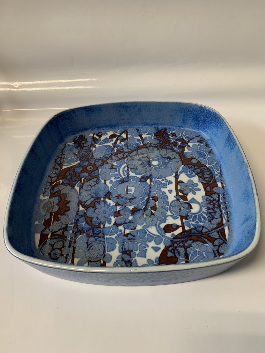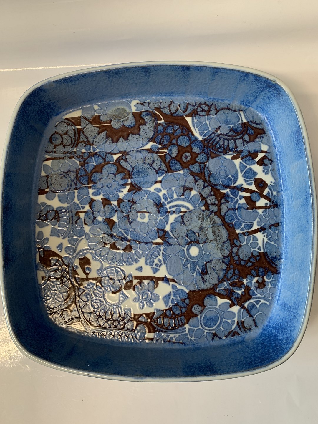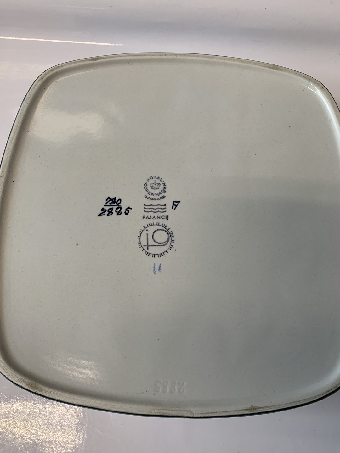 Royal Copenhagen Fajance Baca, stort blåt fad. Dekorationsnummer 780/2885. 1. sortering. Måler 26,6 x 26,6 cm. Pæn og velholdt.