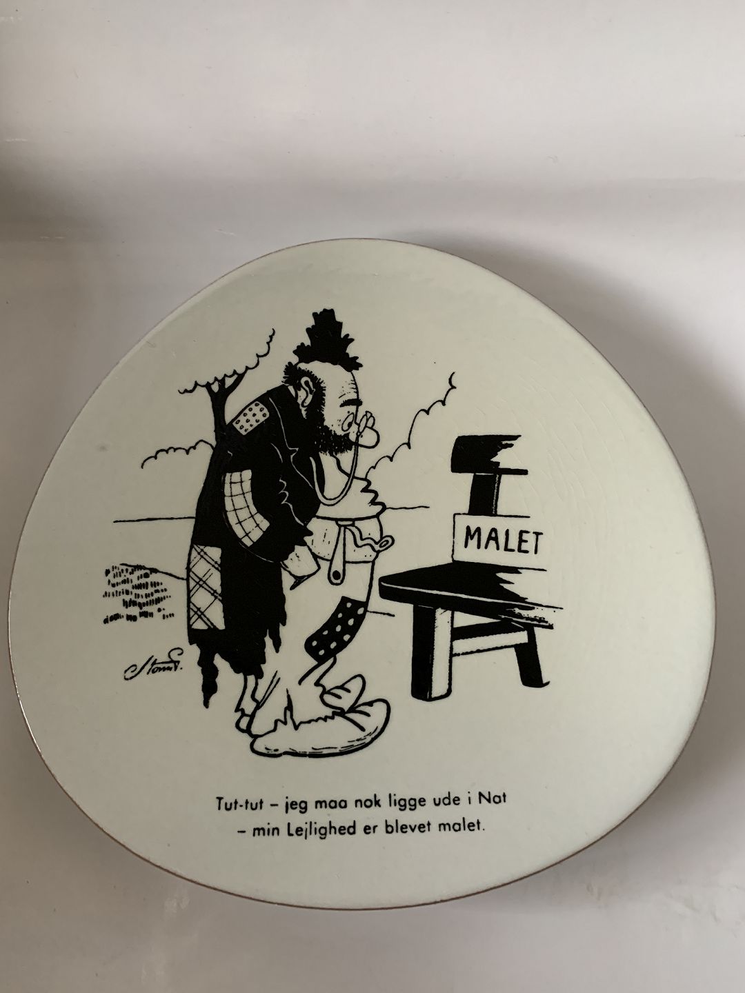 Knabstrup Plate with Storm P. Motif and Verse Text:- Tut-tut - I'll probably have to lie out tonight - my apartment has been painted. Designed by Johannes Hansen Measures 16 cm Perfect condition