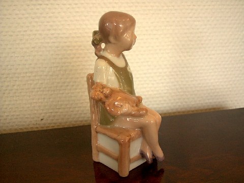 Royal Copenhagen Figure: Girl sitting on chair holding teddy bear. The decoration number is 5195, factory second, height 12 cm. Perfect condition.