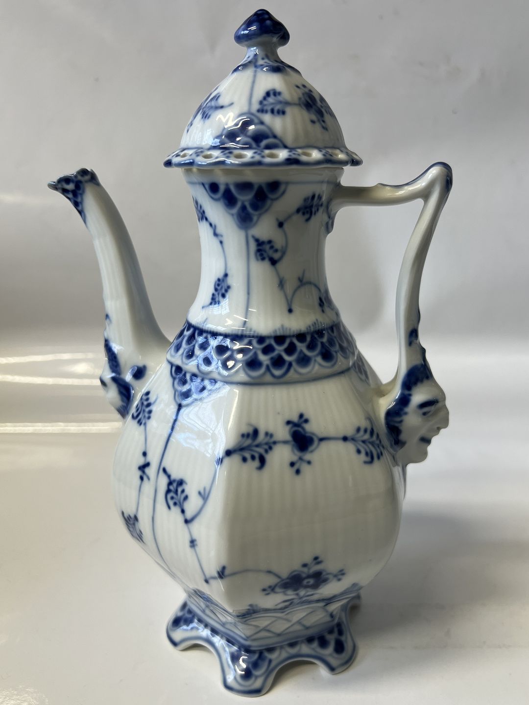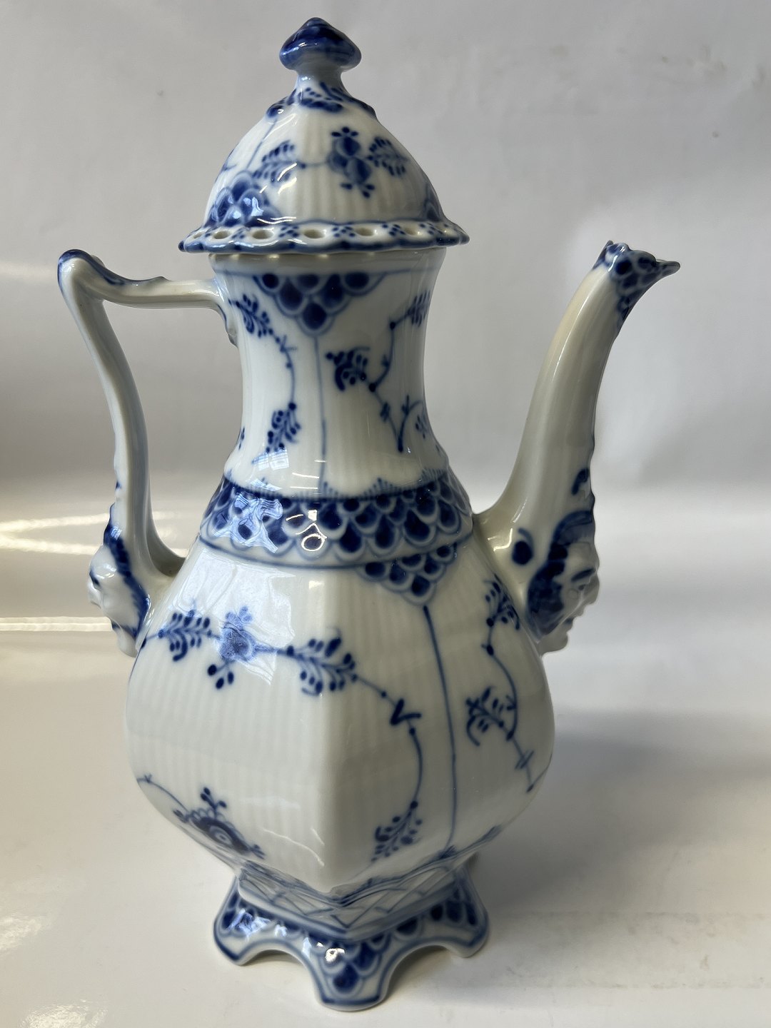 Royal Copenhagen Musselmalet Helblonde, lille kaffekande. Dekorationsnummer 1/1030. Denne er produceret i 1957. 1. sortering. Højde 21,0 cm. Perfekt stand uden fejl.