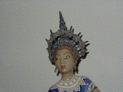 Dahl Jensen Figur af Siamesisk Tempel Danserinde. Dekorationsnummer 1125, 2. sortering. Højde 25,5 cm, længde 27,5 cm. En imponerende figur der er fantastisk udført og flot i farverne.