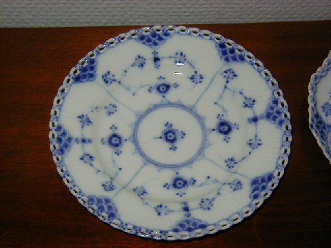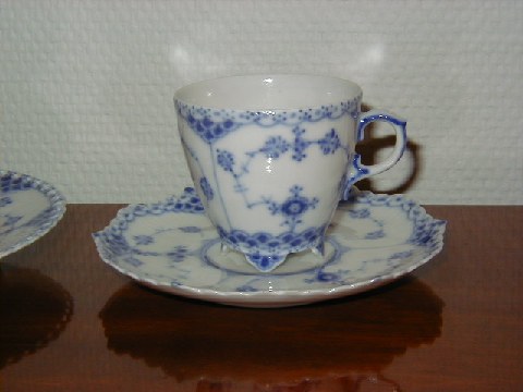6 sæt Kongelig Musselmalet Helblonde kopper med fødder samt helblonde sidetallerkner. Kopperne og underkopper har nummer 1/1037, tallerknerne har nummer 1/1088. Prisen er for 1 sæt bestående af kop, underkop og sidetallerken.