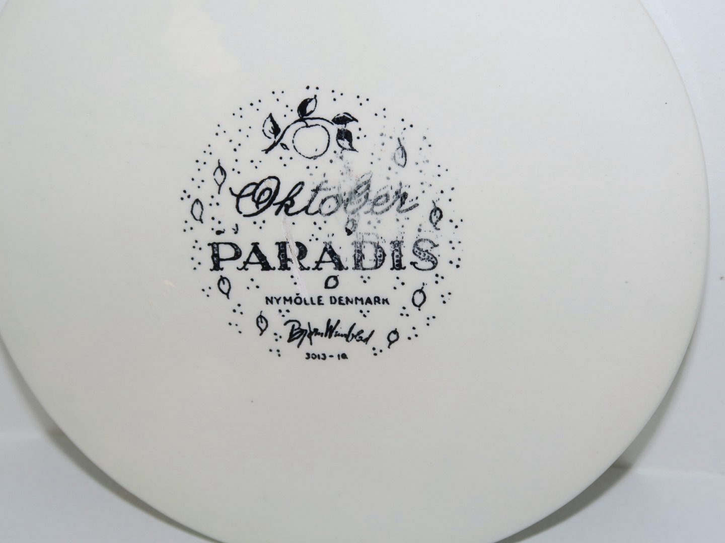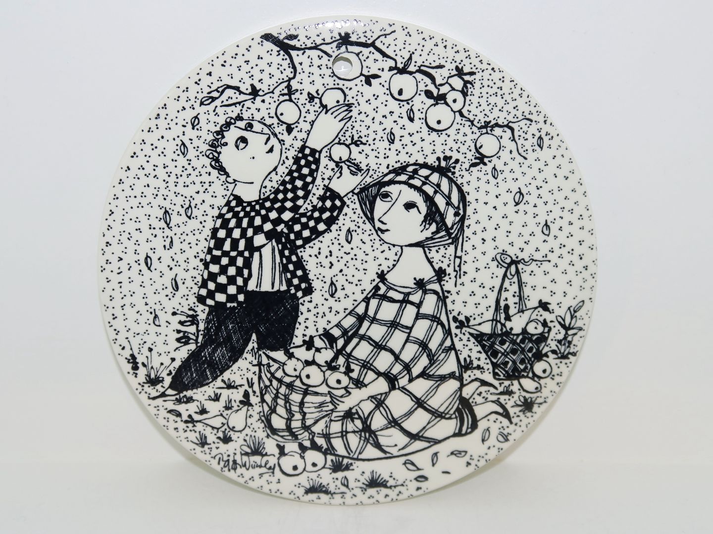 Bjørn Wiinblad keramik udført hos Nymølle. Månedsplatte / smørbrik med sort dekoration, Oktober. Dekorationsnummer 3013-10. Diameter 15,0 cm. Perfekt stand.
