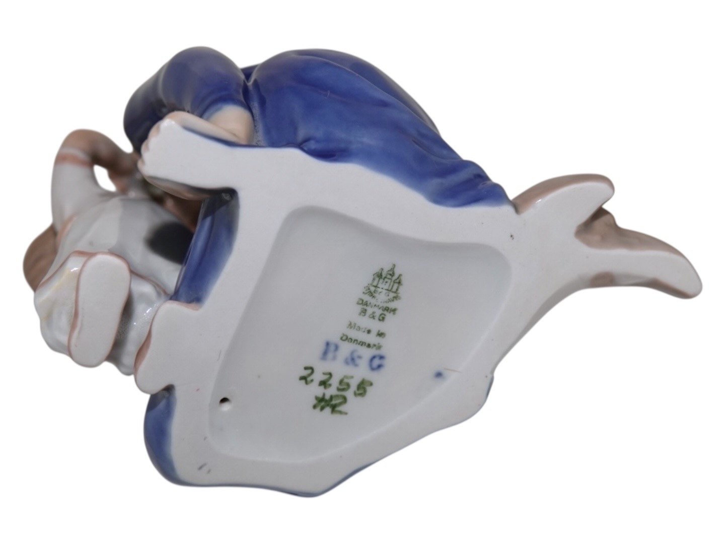 Bing & Grøndahl figur, mor med barn. Af fabriksmærket ses det, at denne er fra mellem 1952 og 1958. Dekorationsnummer 2255. 1. sortering. Længde 12,5 cm., højde 14,0 cm. Perfekt stand uden fejl.