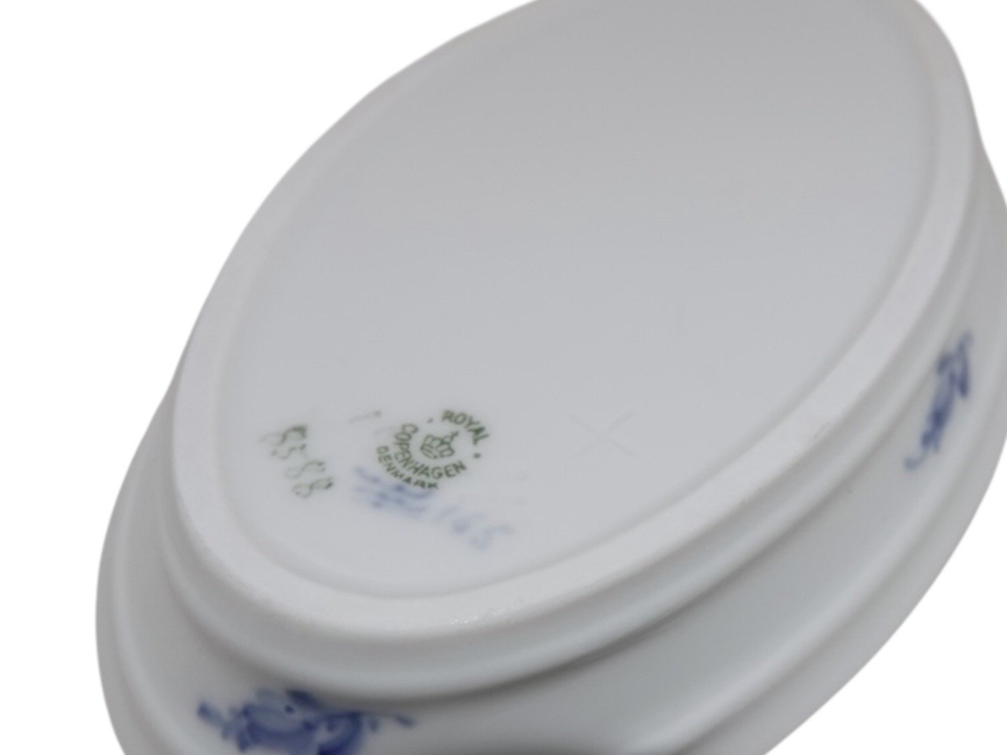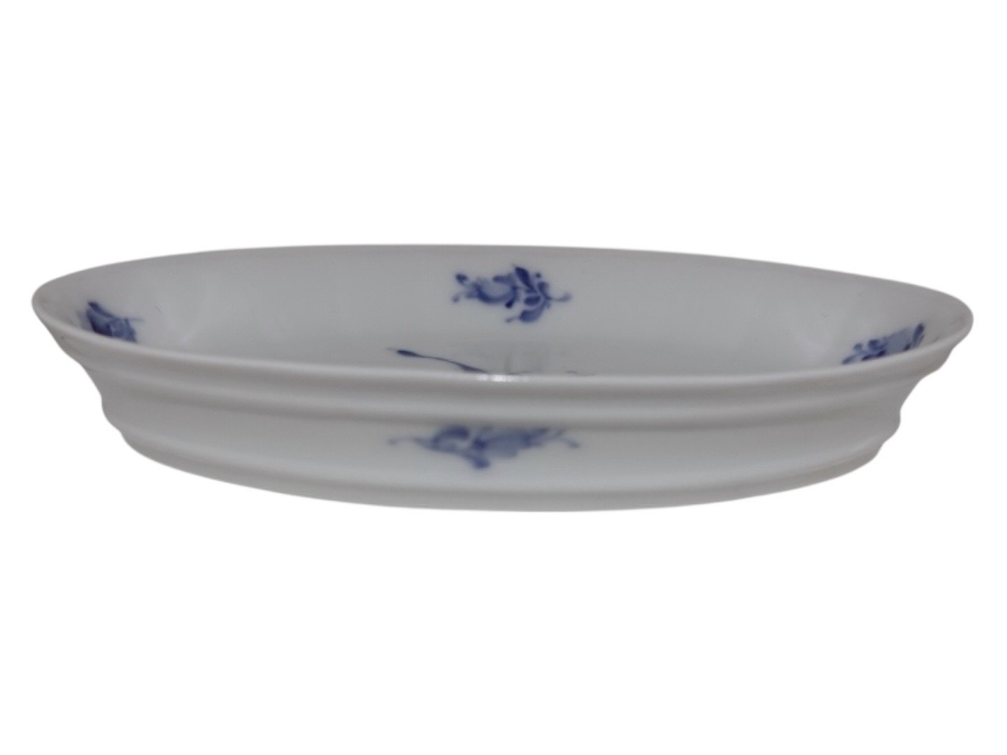 Royal Copenhagen Blå Blomst Kantet, lille oval asiet. Af fabriksmærket kan det udledes, at denne er fra mellem 1923 og 1928. Dekorationsnummer 10/8588. 1. sortering. Længde 16,8 cm. Perfekt stand uden fejl.