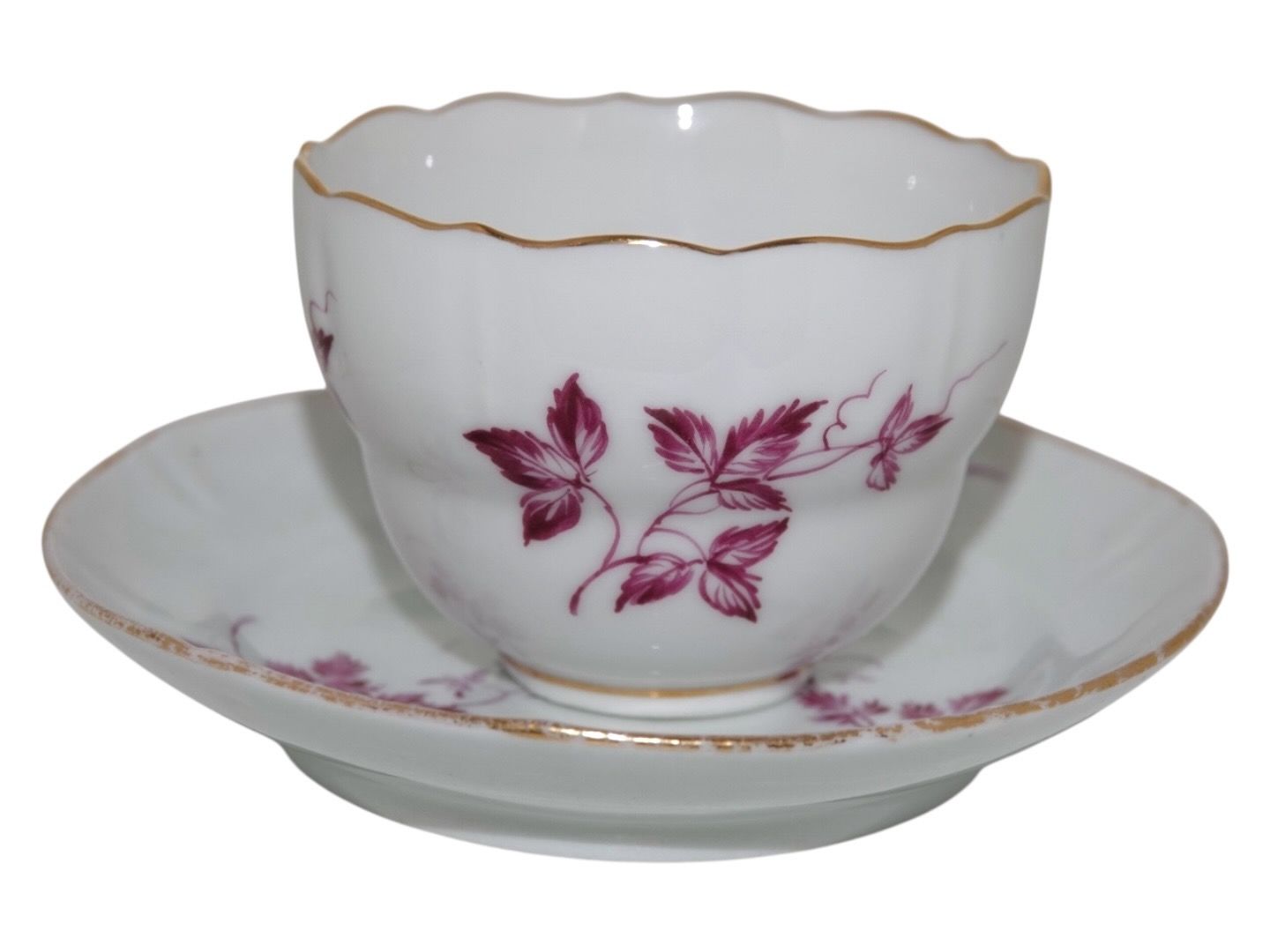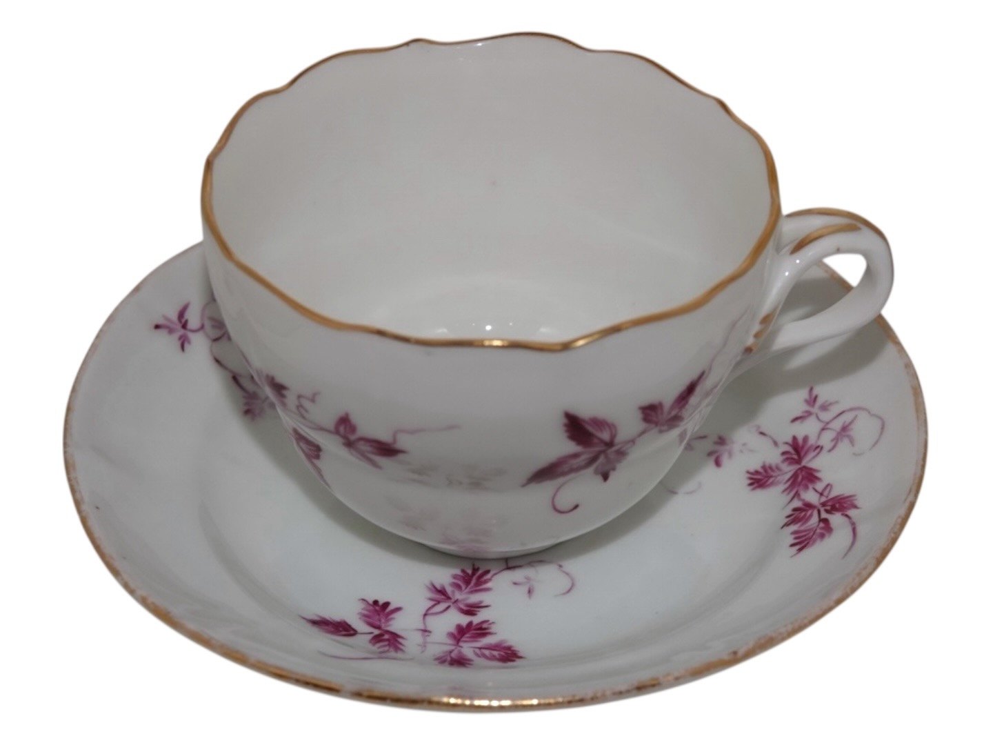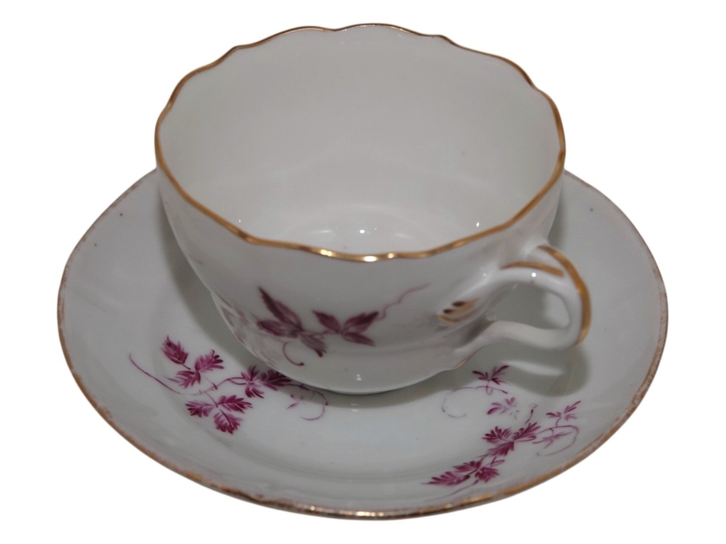 Royal Copenhagen Kaffekop og tilhørende underkop med purpur dekoration fra omkring 1890'erne.