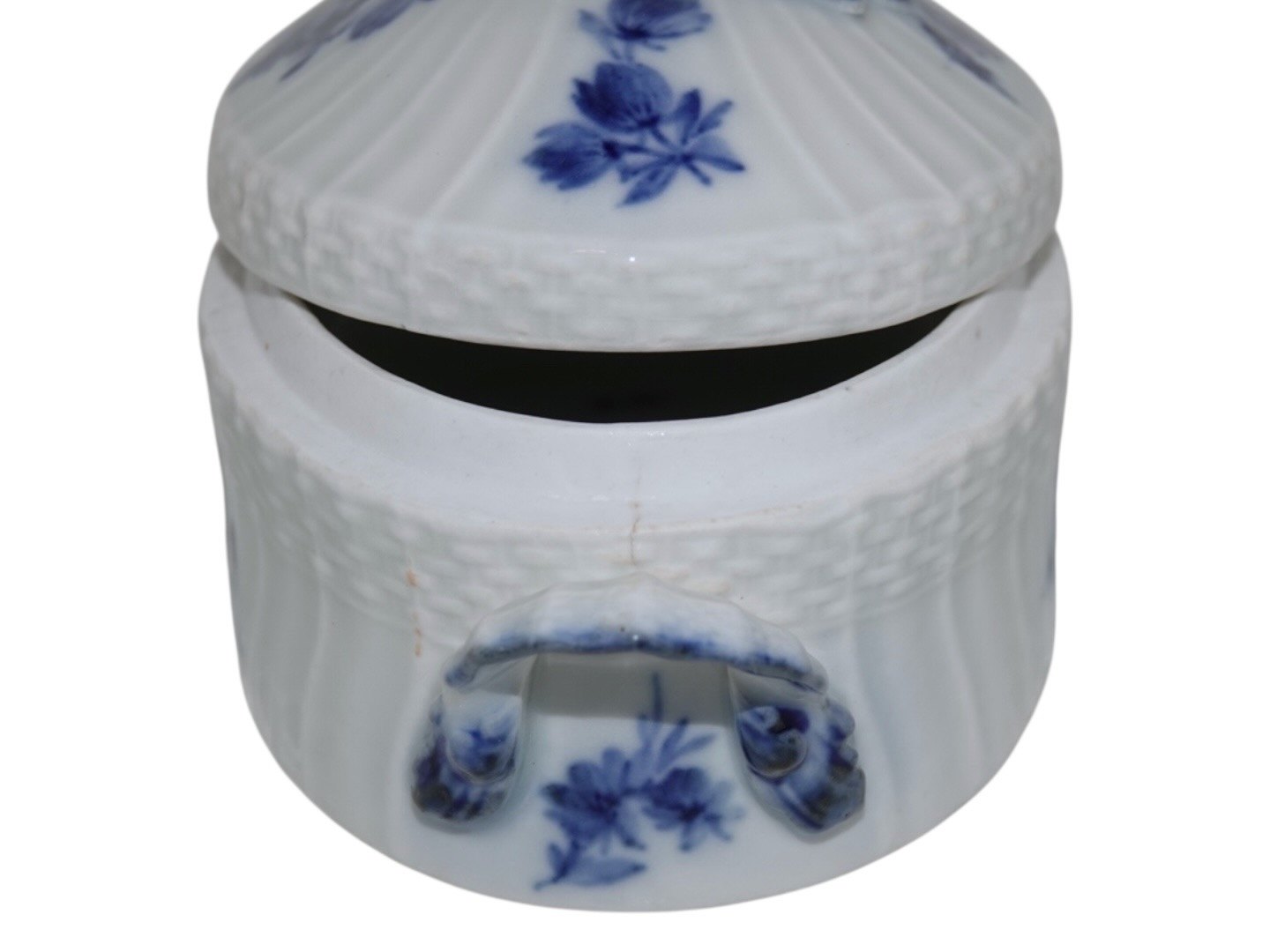 På det tidlige porcelæn er det ofte lidt glasur- eller malerfejl. På denne er der en brændingsfejl ved den ene hank samt enkelte små pletter i glasuren. På lågets knob føles kanten ru, så muligvis er der et skår der. Se venligst nærfotos. Men alt i alt er smørskålen i meget flot og velbevaret stand.