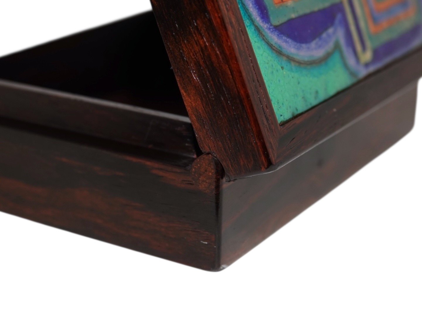 Alfred Klitgaard, lidded rose wood box with Bodil Eje enamel. Marked "KLITGAARD DENMARK". Measures 11.4 by 9.4 cm., height 3.7 cm. Excellent condition. Very well kept.