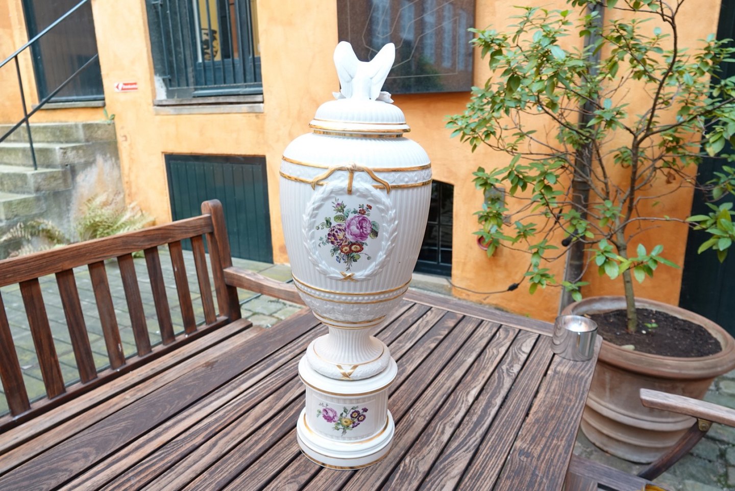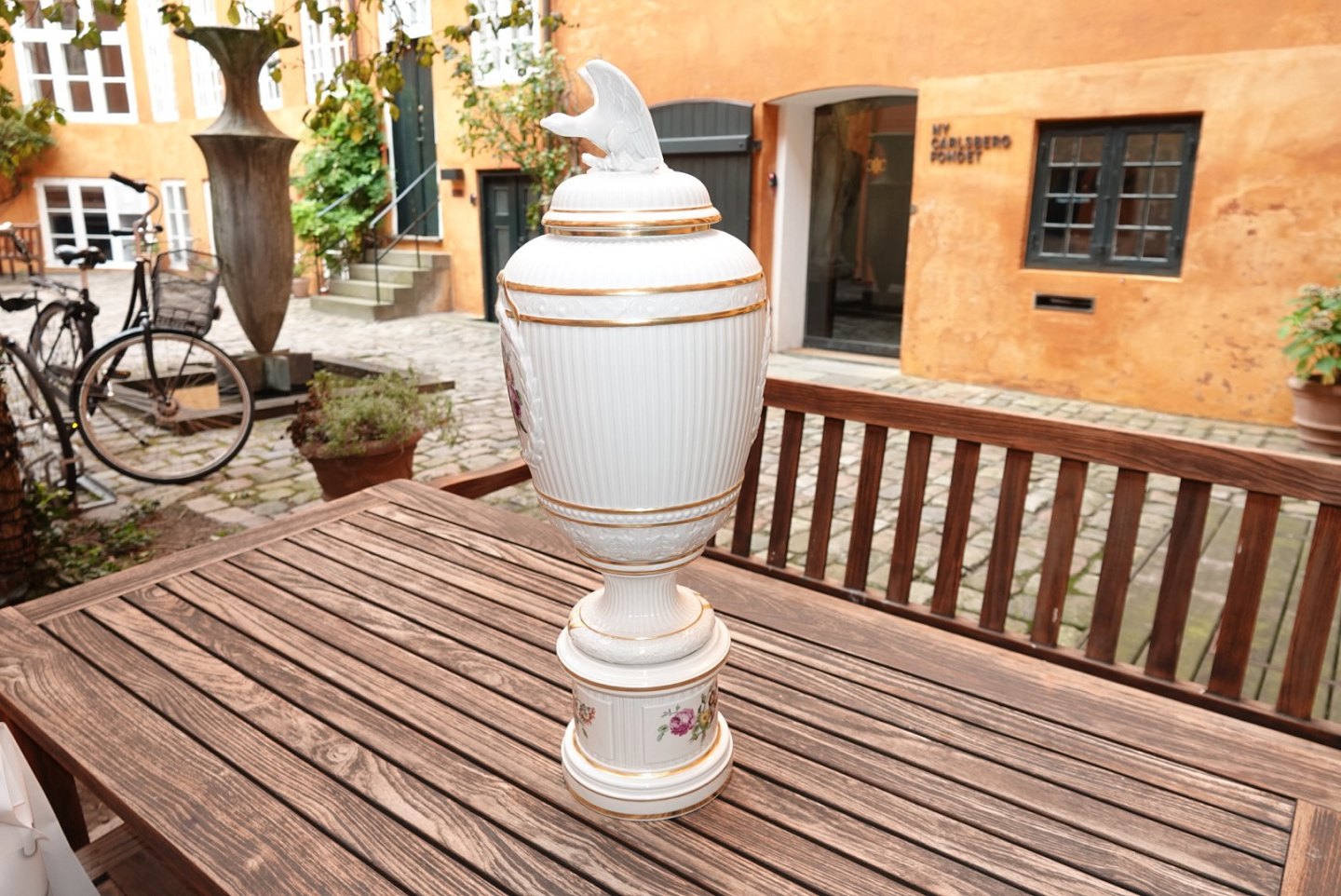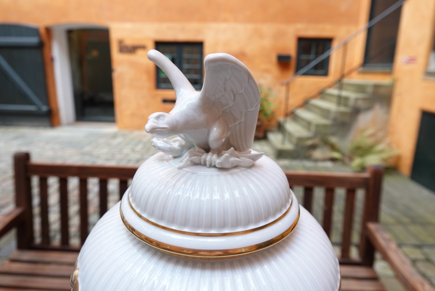 Royal Copenhagen, enormous lidded jar with eagle on top. It is decorated with multicolored flowers as Sachian Flower.