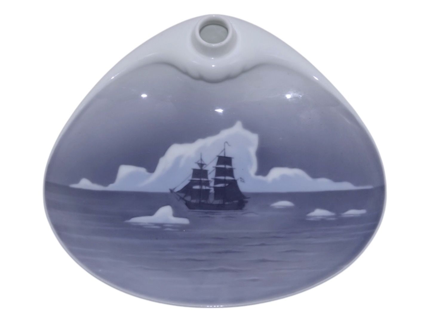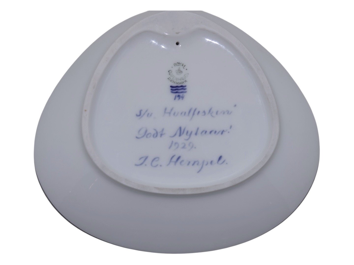 Royal Copenhagen unika asiet/blækhus med motiv fra Grønland. Der mangler et lille låg. Titel bagpå "S/u Hvalfiskeri Godt Nytår 1929 J. C. Hempel". 1. sortering. Måler 18,8 x 17,0 cm. Perfekt stand uden fejl.