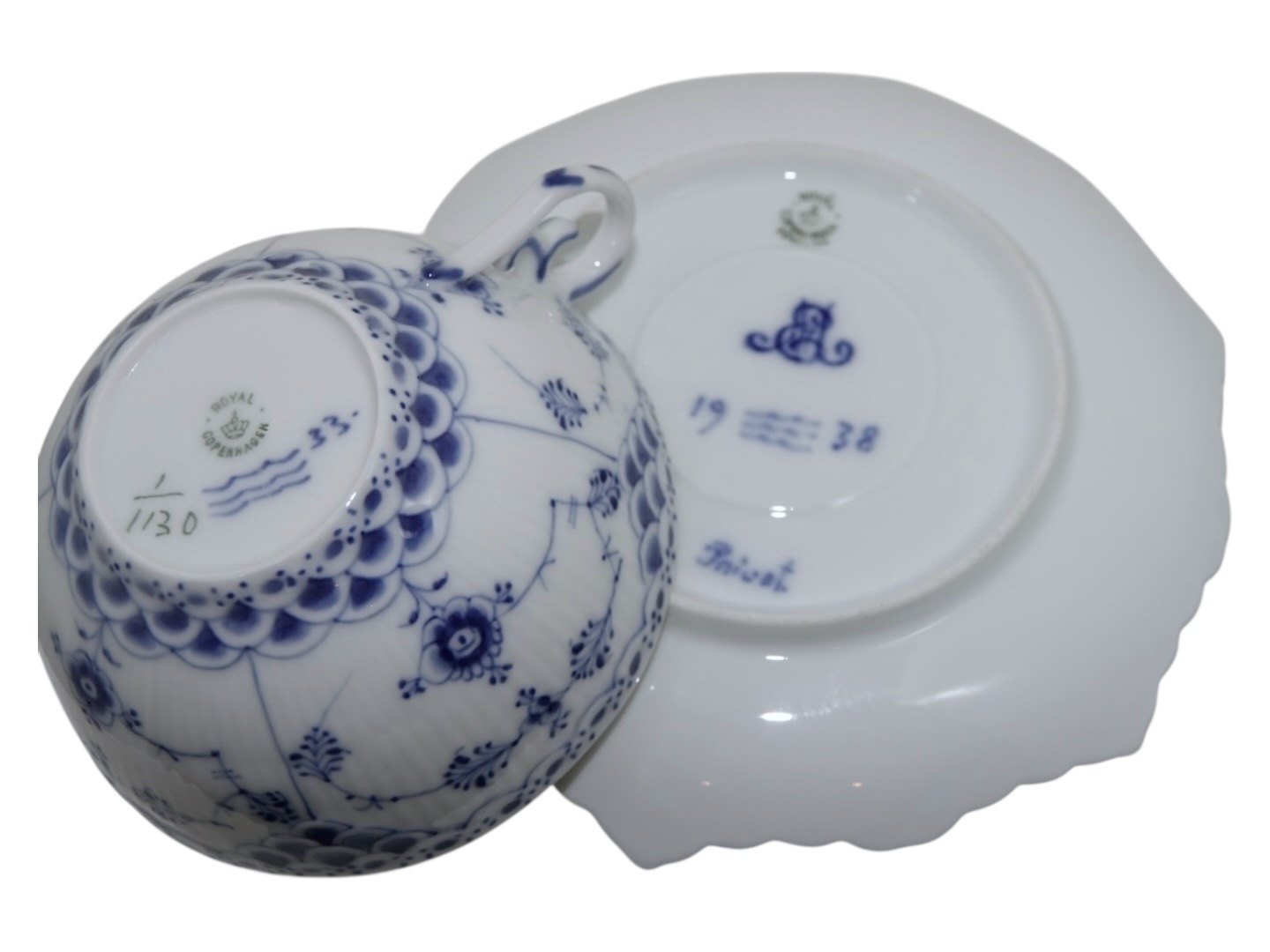 Underkoppen er mærket PRIVAT (På denne tid fik blåmalerne lov til at male 1 ting til dem selv til jul. Disse blev mærket PRIVAT. Således er disse oftest ganske smukt bemalet.