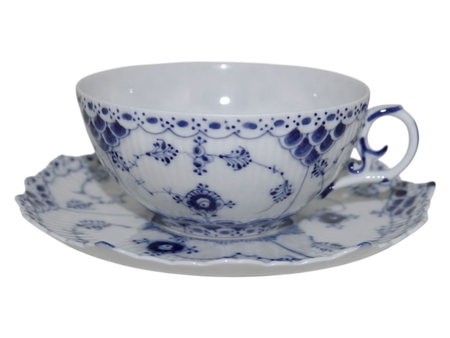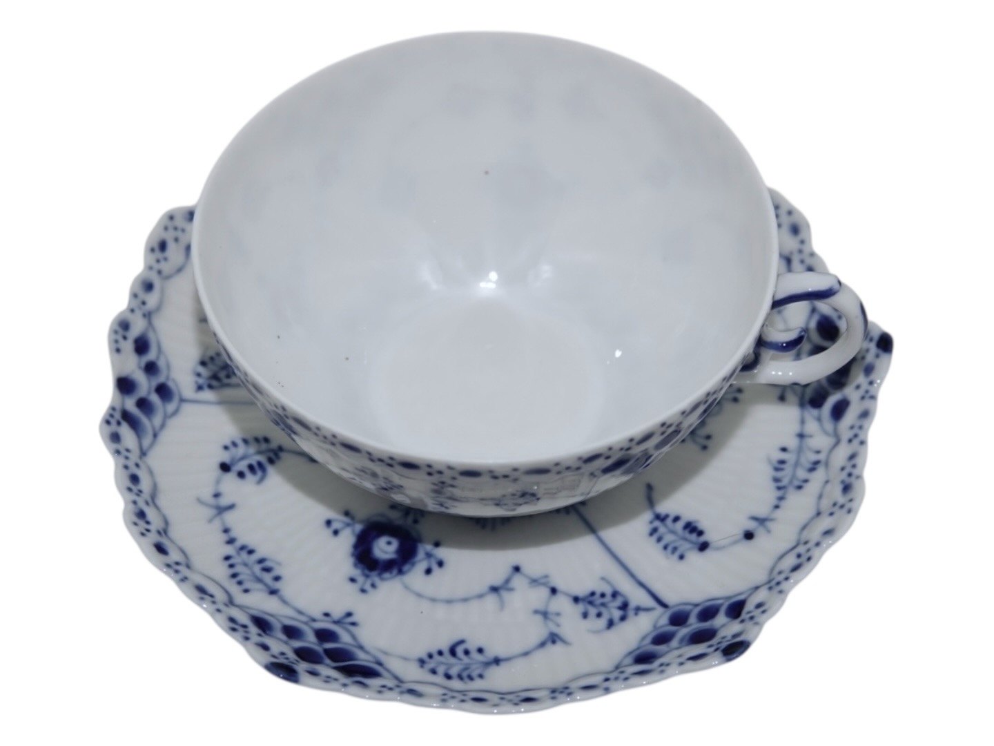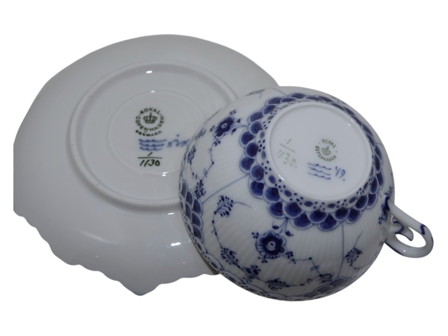 Royal Copenhagen Musselmalet Helblonde, tekop med tilhørende underkop. Dekorationsnummer 1/1130. Der er aldersforskel på kop og underkop. 2. sortering. Koppens diameter er 9,9 cm. Perfekt stand uden fejl.