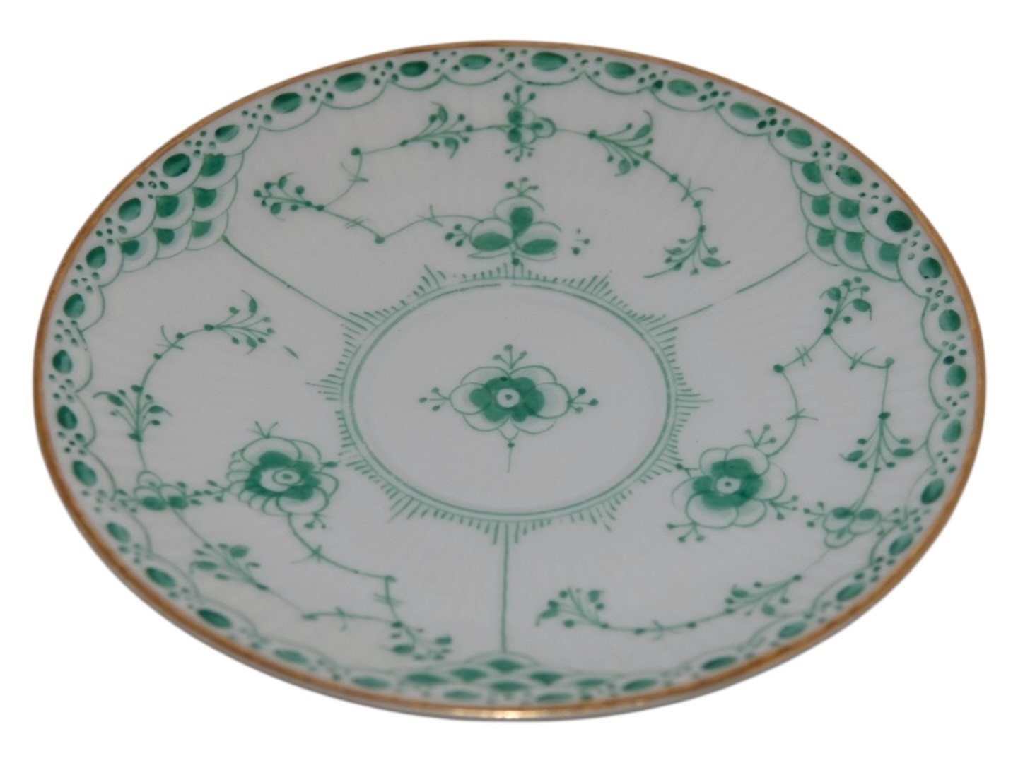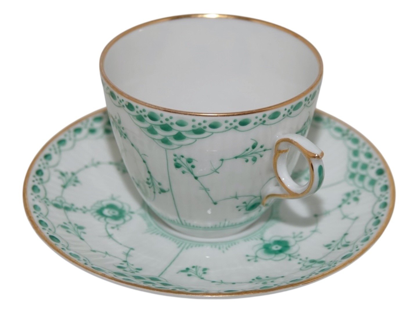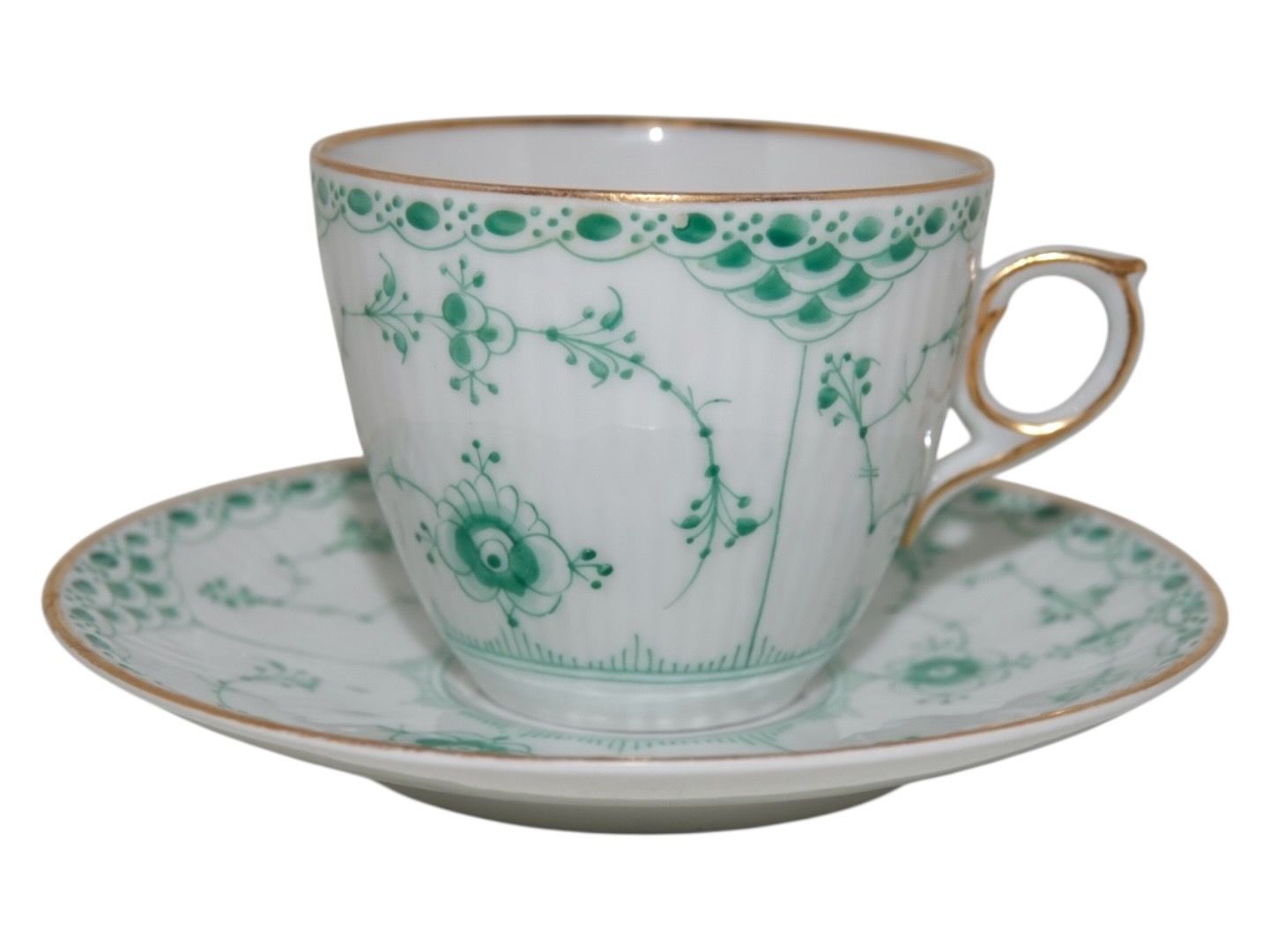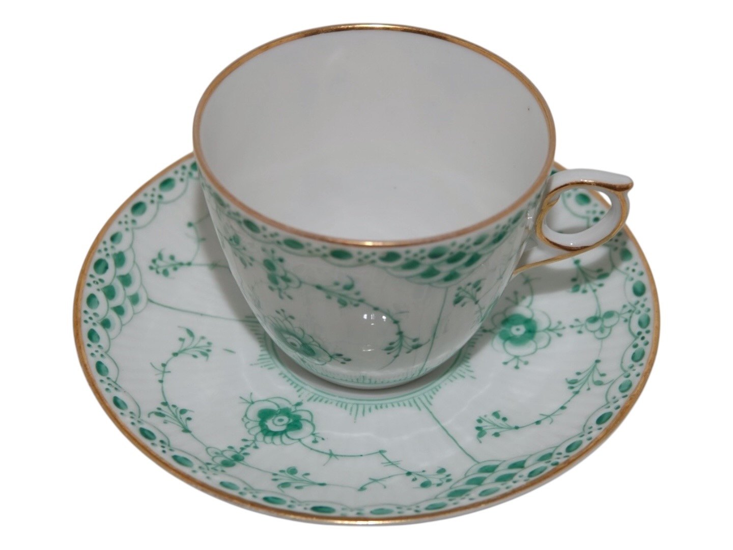 Royal Copenhagen Grøn Musselmalet Halvblonde med guldkant, lille kaffekop med tilhørende underkop.