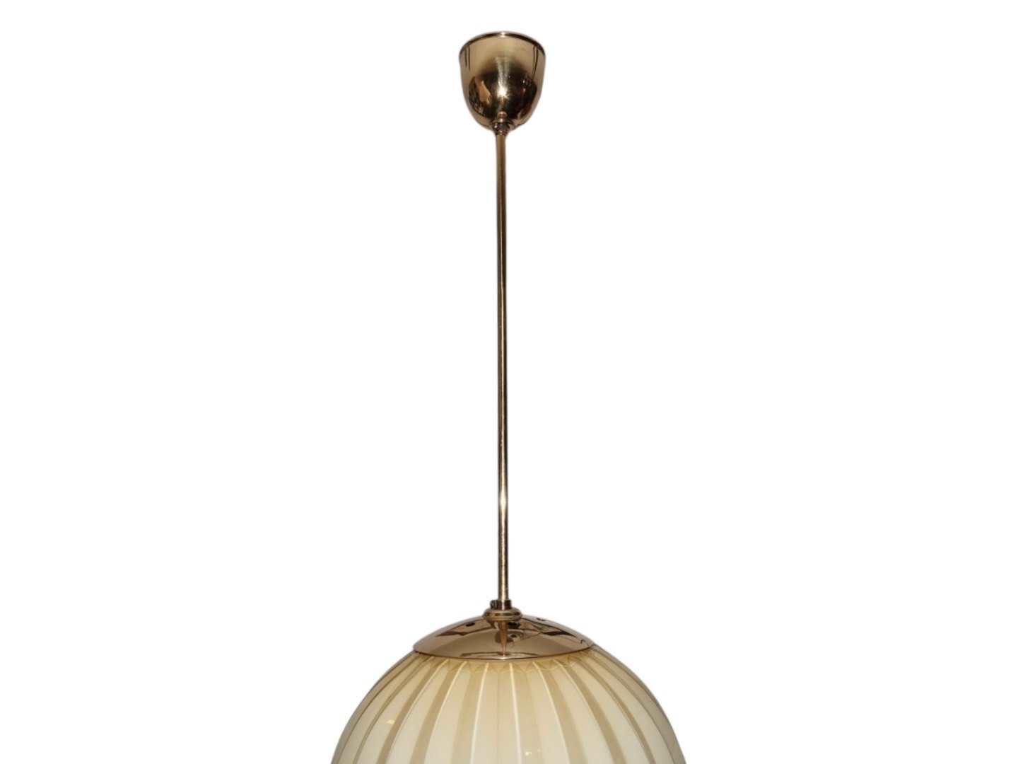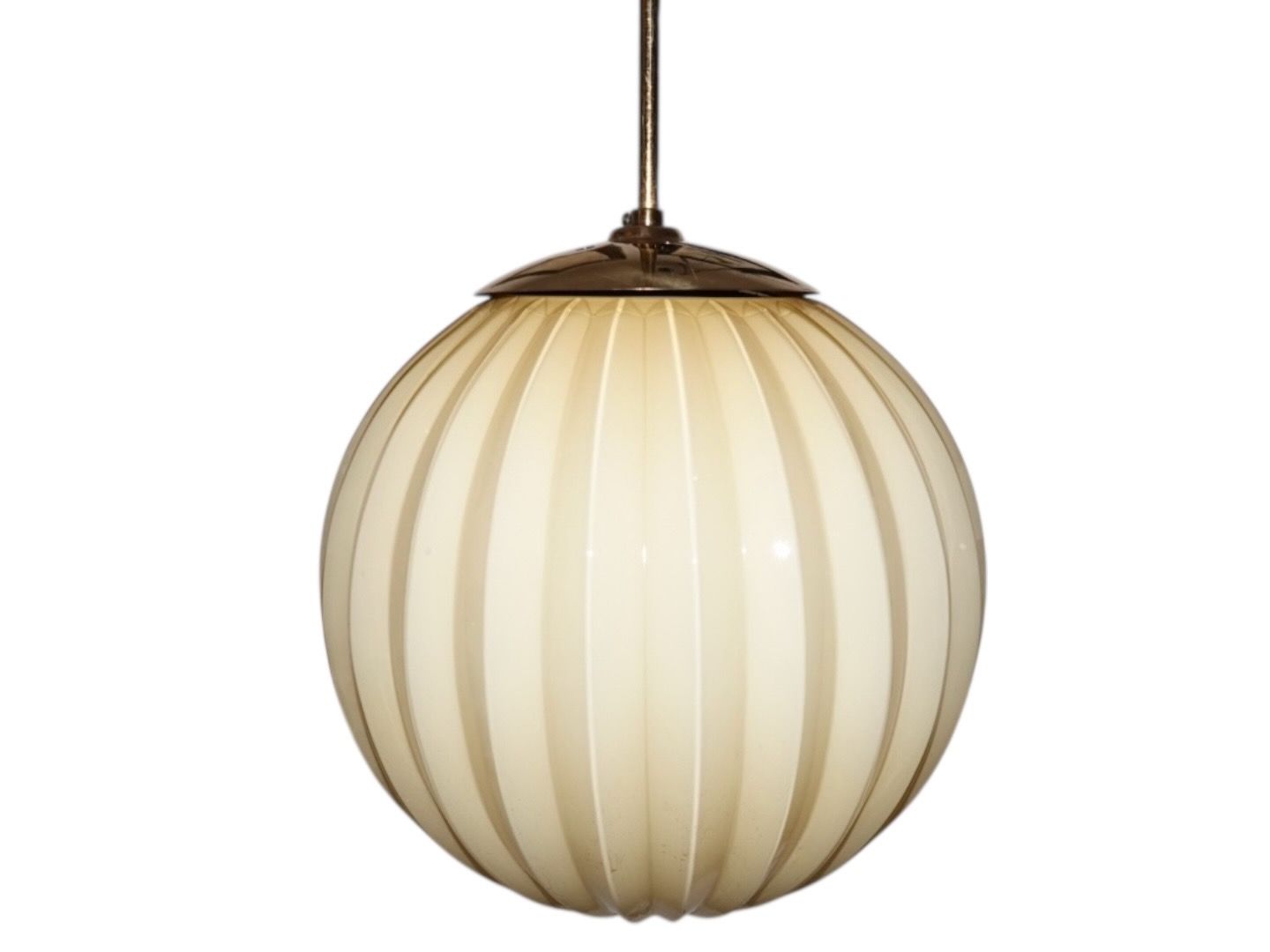 Art Deco loftslampe i cremefarvet rillet glas med messing stang.