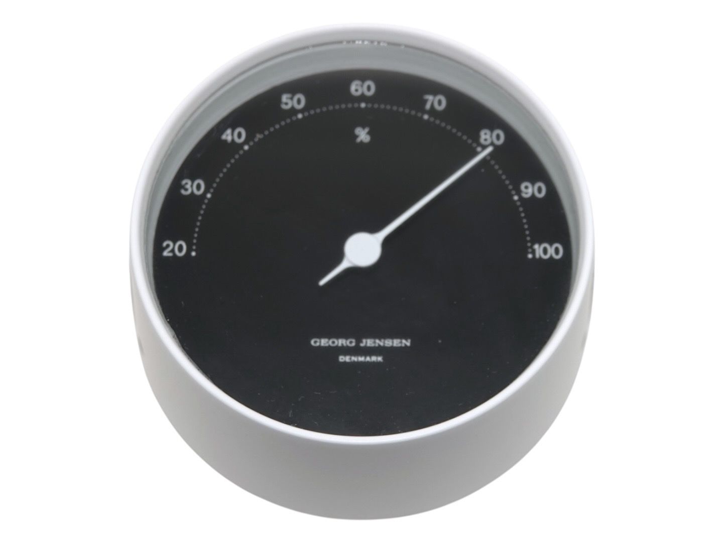 Georg Jensen Hygrometer i hvid kasse med sort skive. Et hygrometer måler luftfugtighed. Designet af Henning Koppel. Diameter 10,0 cm., dybde 4,5 cm. Flot og velholdt stand.
