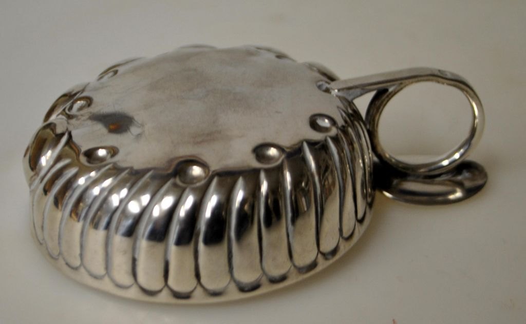 Sølv tastevin, 19./20. årh. Utydelig stemplet. H. 2,8 cm. L.:10 cm. NB: Med småbuler.