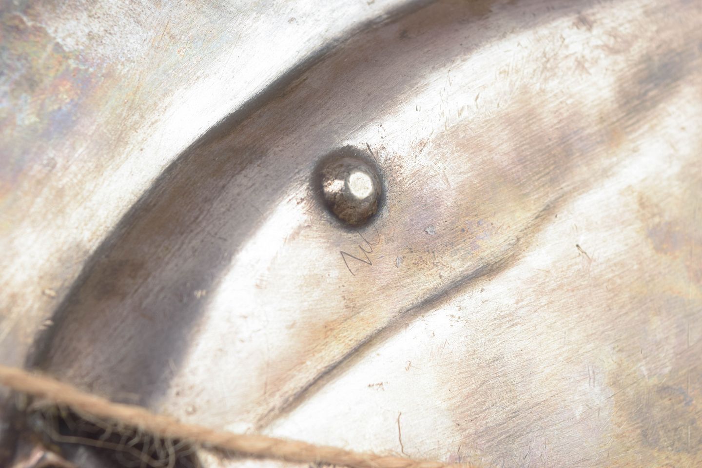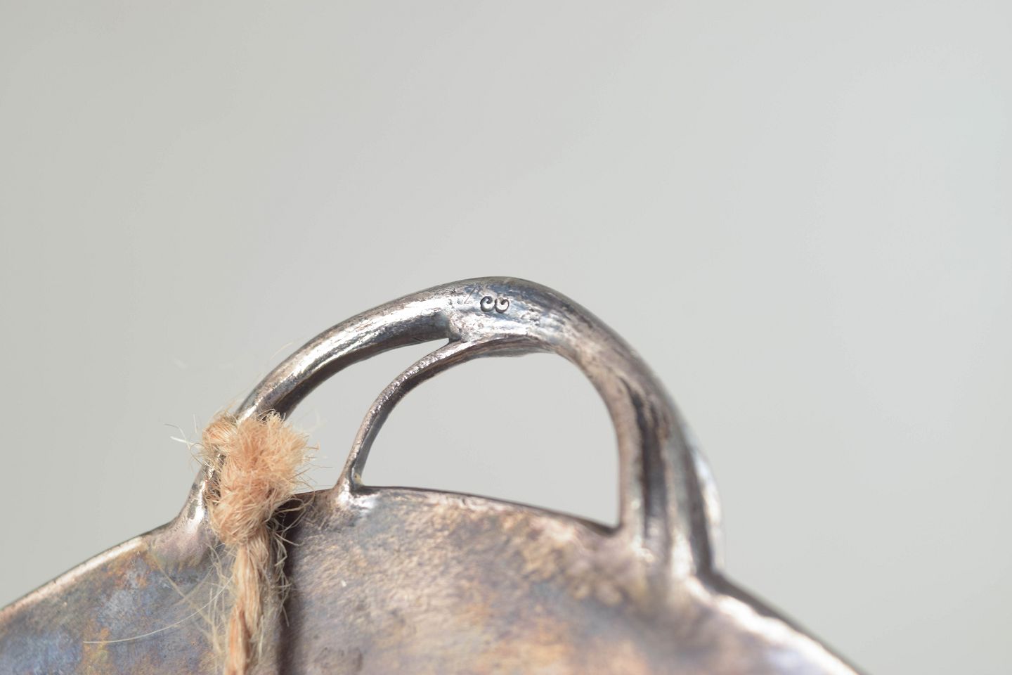 Stort ovalt fad i sølvfarvet metal med reliefdekoration i klassisk jugendstil, forestillende en kvindefigur omgivet af slyngende blomster og blade. Elegant, skulpturel komposition med fine detaljer og blød linjeføring, karakteristisk for WMF’s produktion i perioden. Kan anvendes både som serveringsfad og som vægophæng. Signatur forekommer, men er ikke tydeligt læsbar.