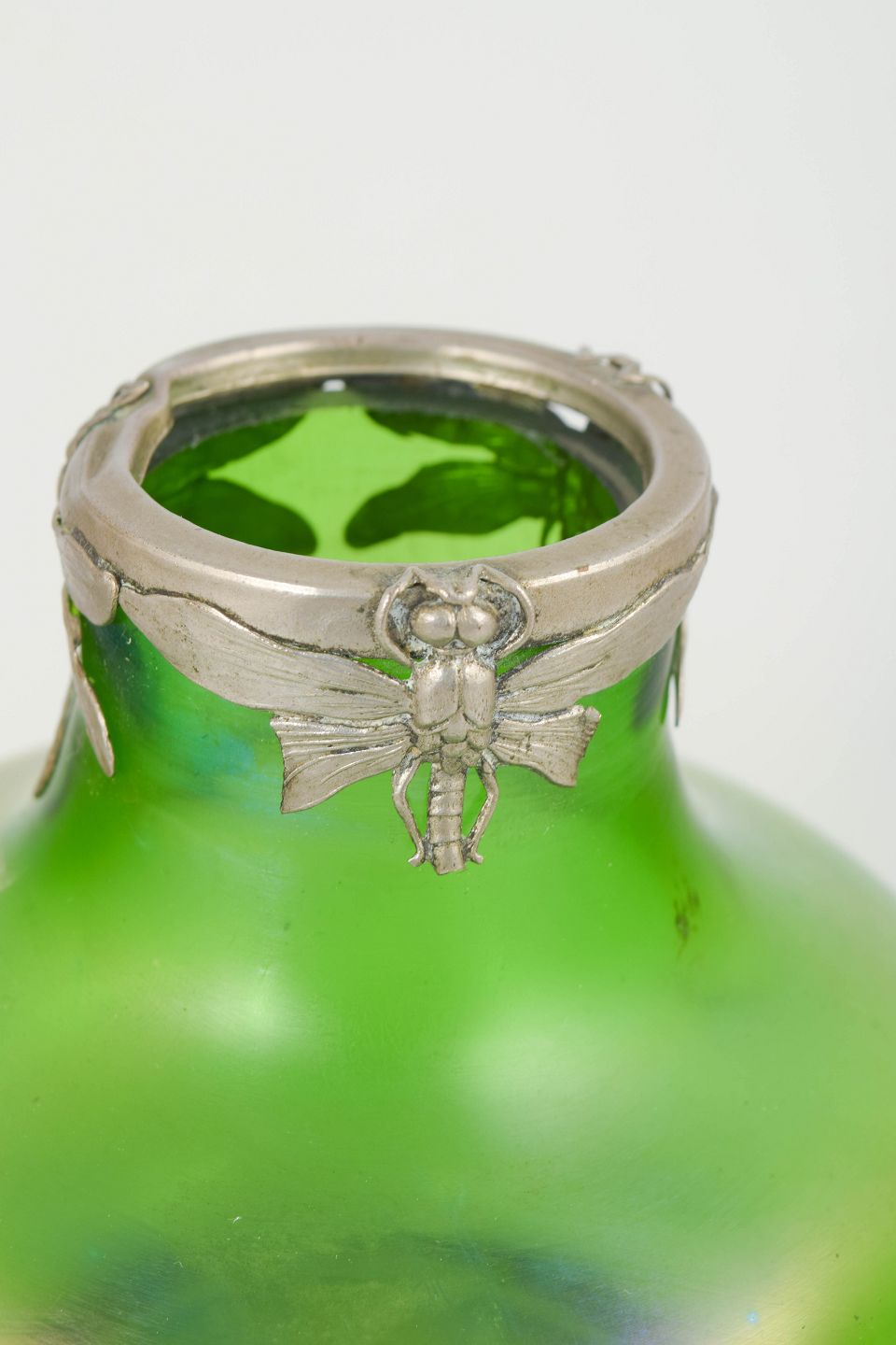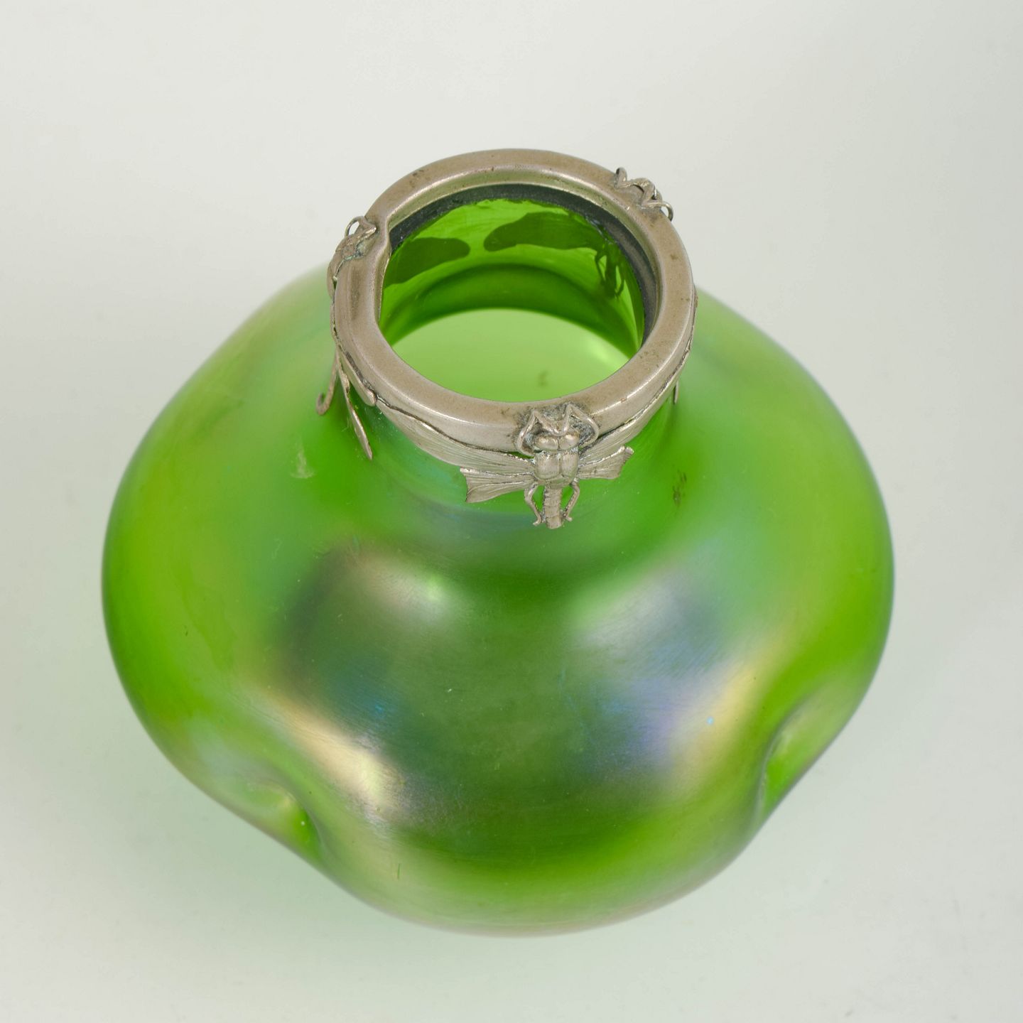 Art Nouveau-vase i iriserende kunstglas med klar grøn grundtone og blødt afrundede, organiske former. Lav og bred bug med let indtrukket hals, afsluttet med dekorativ tinmontering udført i et stiliseret, naturinspireret motiv. Overfladen viser et diskret farvespil med blålige nuancer mod foden, karakteristisk for perioden.