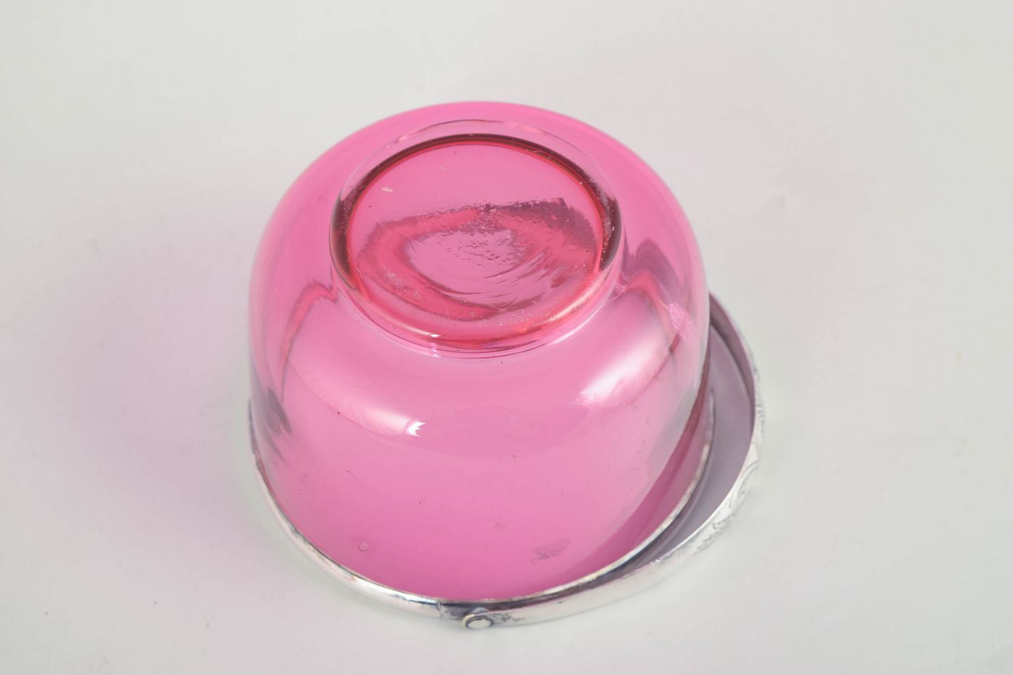 Rund skål i rosa glas med påsat forsølvet metalhank udført i enkel, funktionel form med let transparent gods.