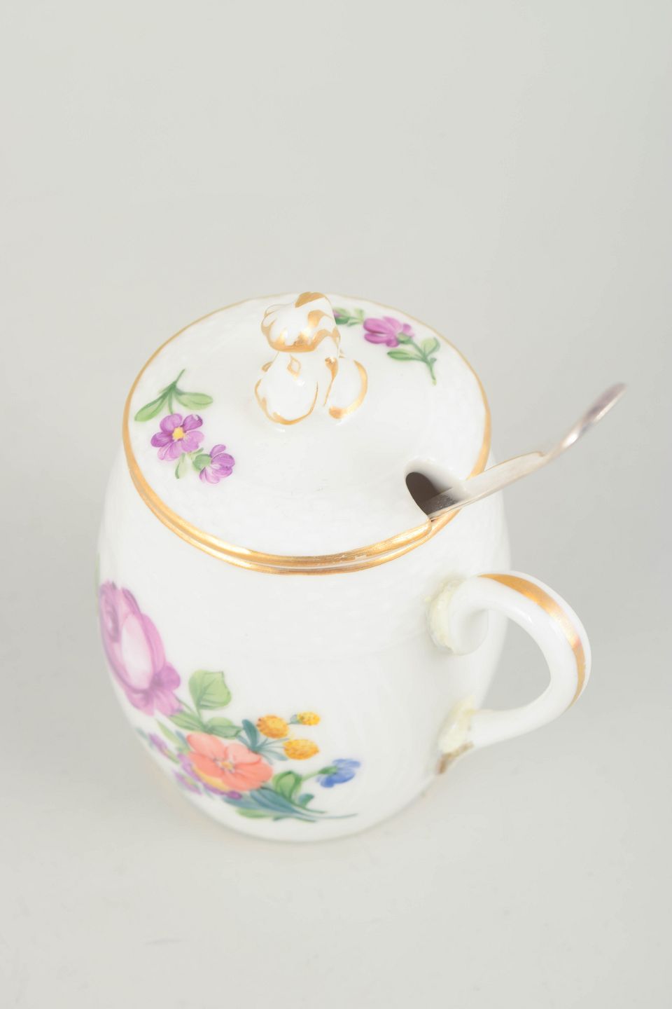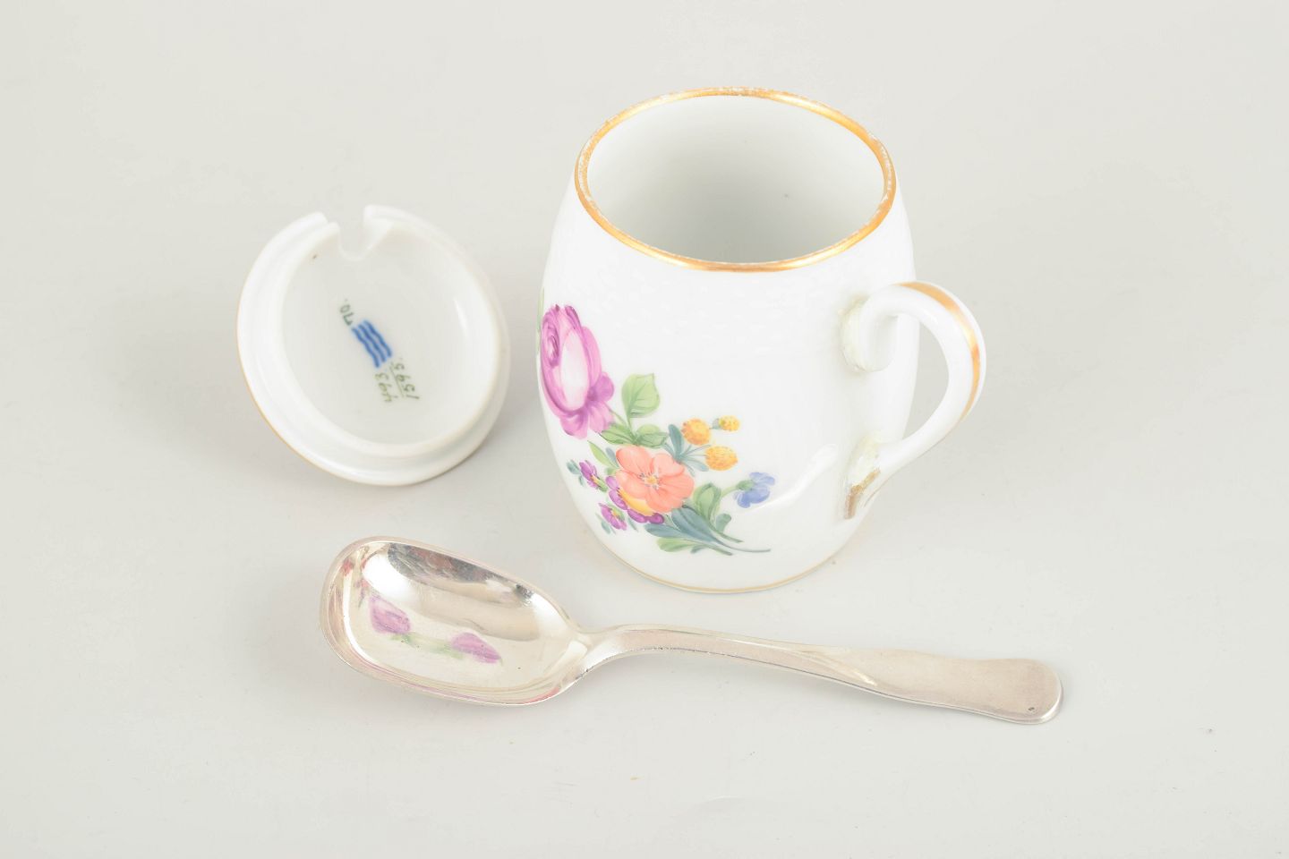 Håndmalet porcelæns sennepskrukke dekoreret med saksisk blomst, model 493/1595, med tilhørende sølvske fra Hans Hansen.