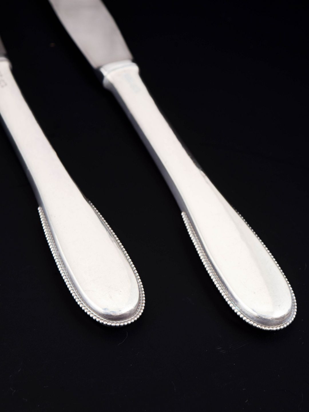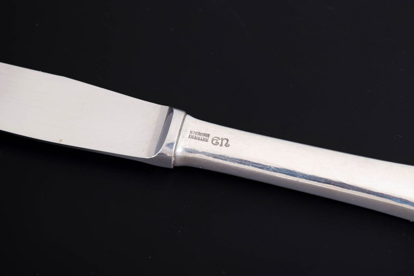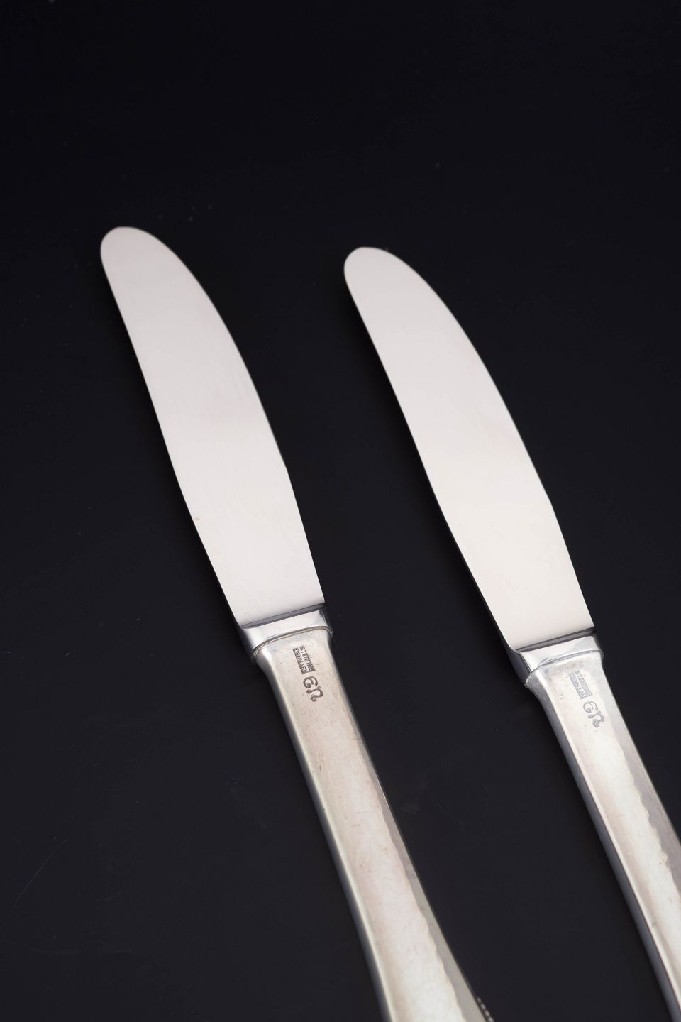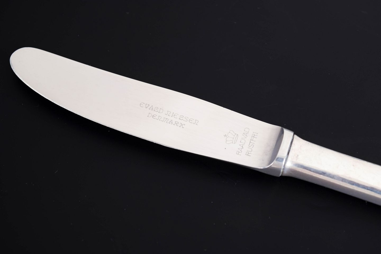 Elegante frokostknive i sterlingsølv og rustfrit stål. Model nummer 14 med klassisk, let afrundet skaftform med diskret perlekant og glat klinge. Fremstillet hos Evald Nielsen.