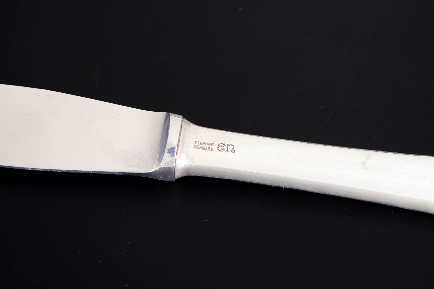 Elegante middagsknive i sterlingsølv og rustfrit stål. Model nummer 14 med klassisk, let afrundet skaftform med diskret perlekant og glat klinge. Fremstillet hos Evald Nielsen.
