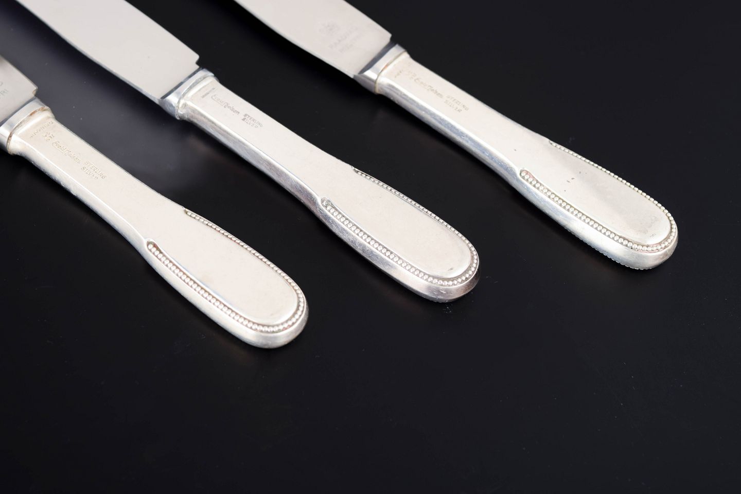 Elegante frokostknive i sterlingsølv og rustfrit stål. Model nummer 14 med klassisk, let afrundet skaftform med diskret perlekant og glat klinge. Fremstillet hos Evald Nielsen.