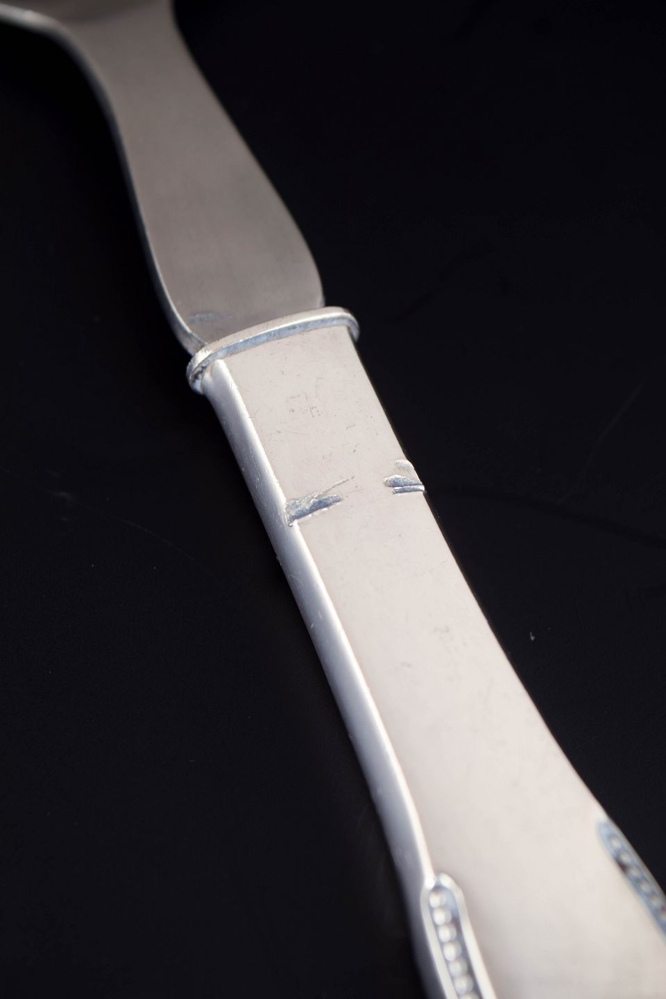 Elegant salatgaffel i sølv 830 og rustfrit stål. Model nummer 14 med klassisk, let afrundet skaftform med diskret perlekant. Fremstillet hos Evald Nielsen.