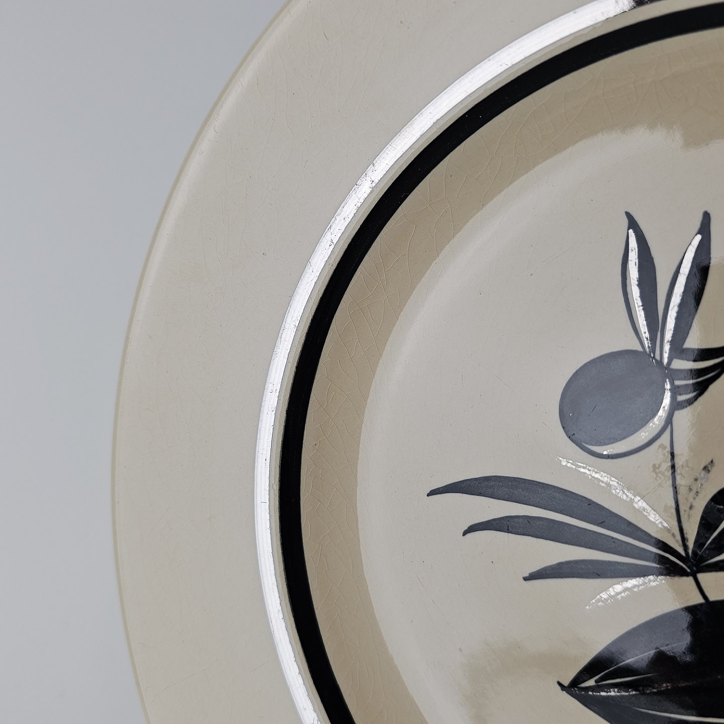 Råhvidt fajancestel i stelform E med dekoration af naturmotiver i sølv og sort farve.