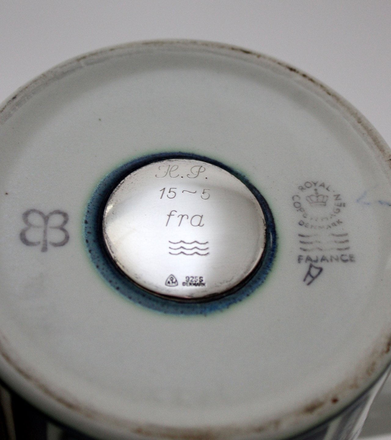 Royal Copenhagen, fajance, Stort årskrus 1975 med 925 sterlingsølv plaquette i bund, den ene med indgraveret tekst. Kunstner Bodil Buch. Nr. 3135. Årskrusene er produceret fra 1967 og frem til 2014. Højde 11,5 cm. Diameter 10,5 cm. I. sortering. Flot stand. Pris: 300 kr. stk. Lager: 2