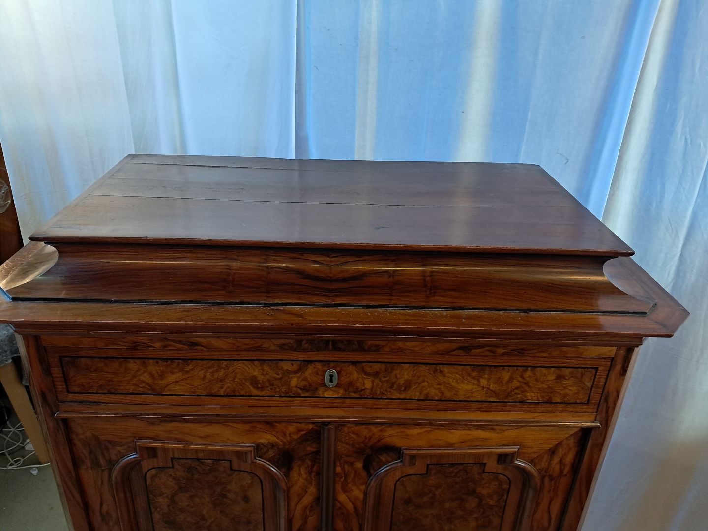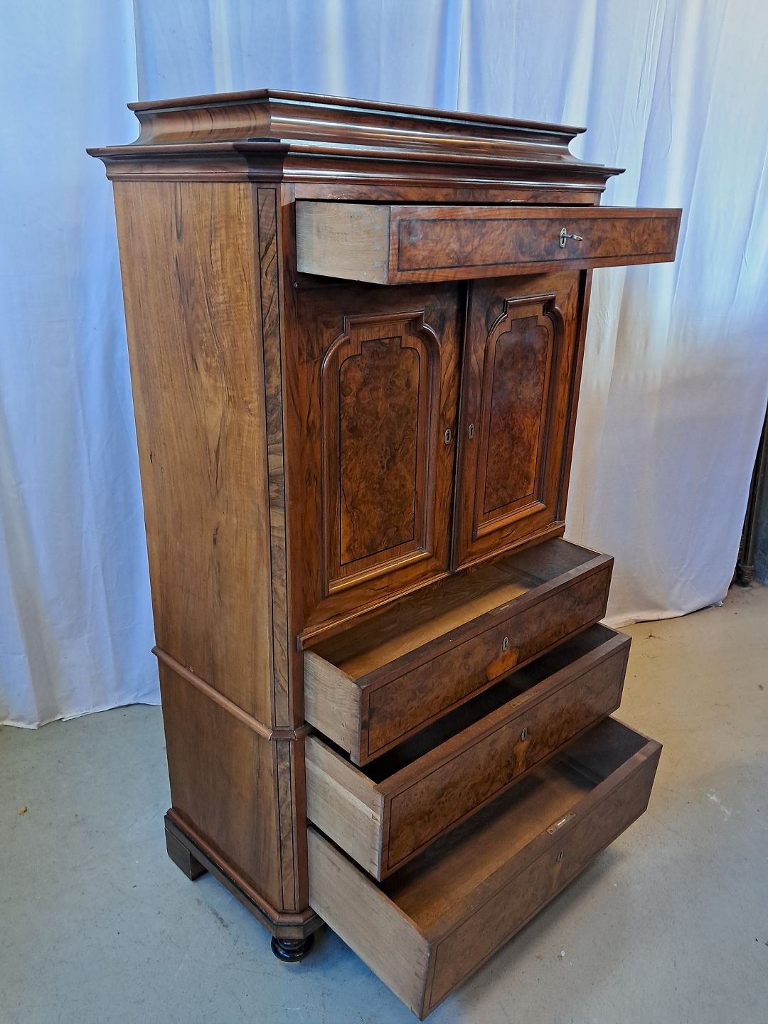 Skab i fineret mahogni og nøderod, fra 1900erne.