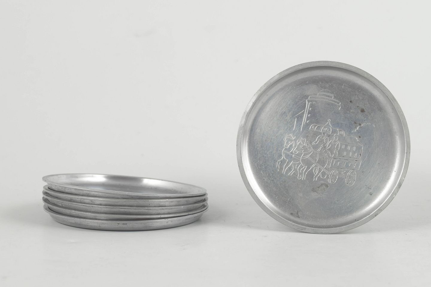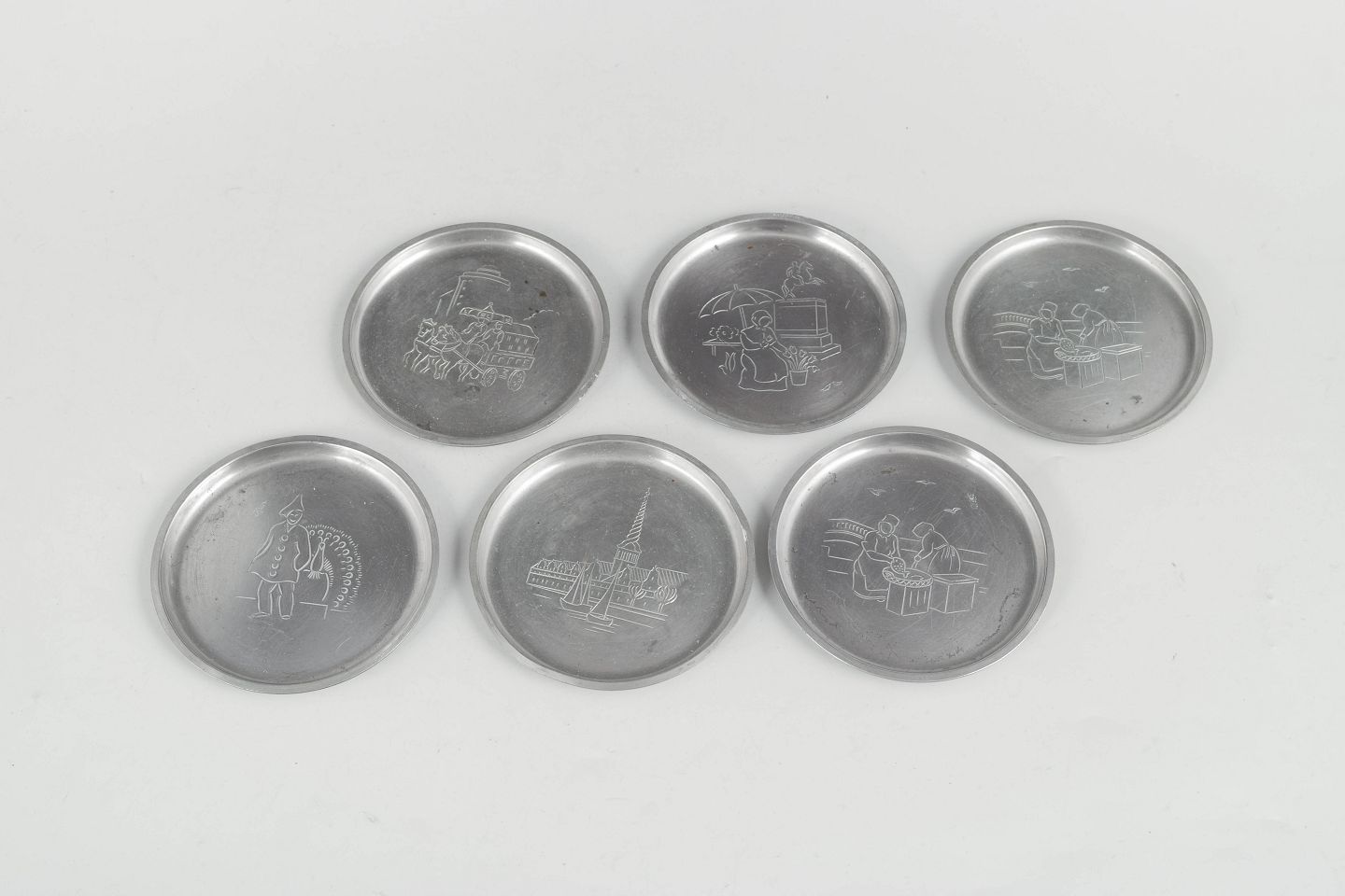 Sæt af seks flaskeunderlag i tin med indgraverede københavnermotiver i et dekorativt art deco formsprog. Model 2387.