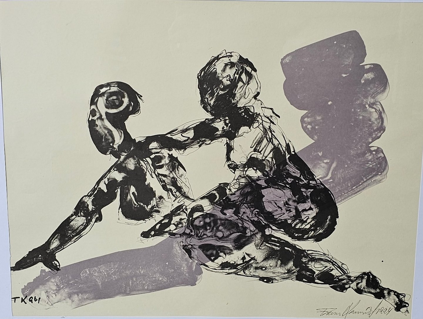 Akvaral på papir med abstrakt motiv af to mennesker i sort og grå. Monteret i sølvramme
