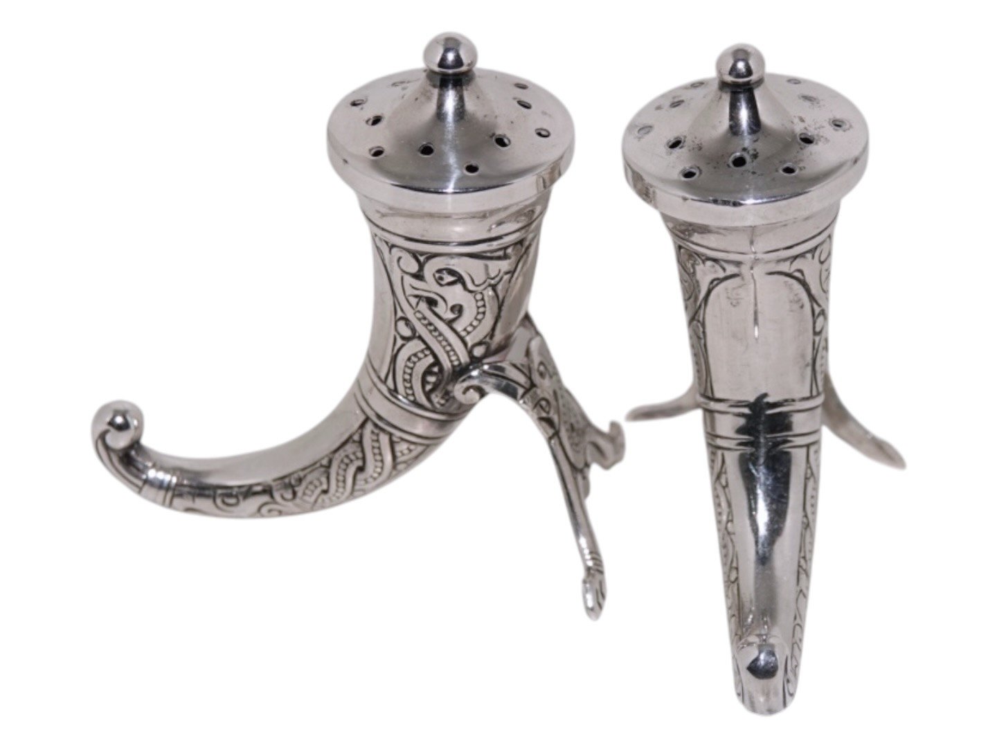 Theodor Olsen Norge, salt- og peberbøsse i sterlingsølv i form af vikingehorn.