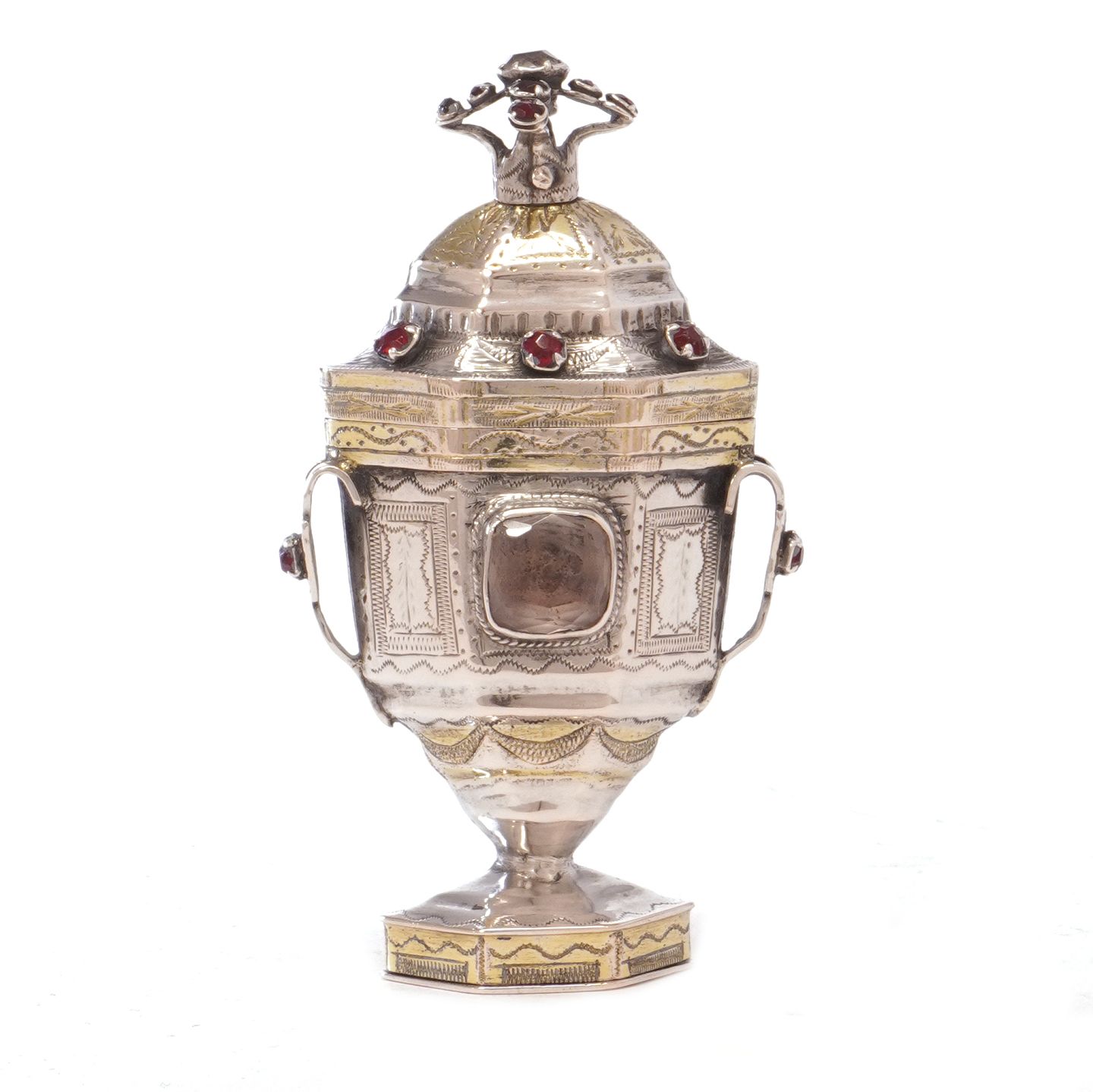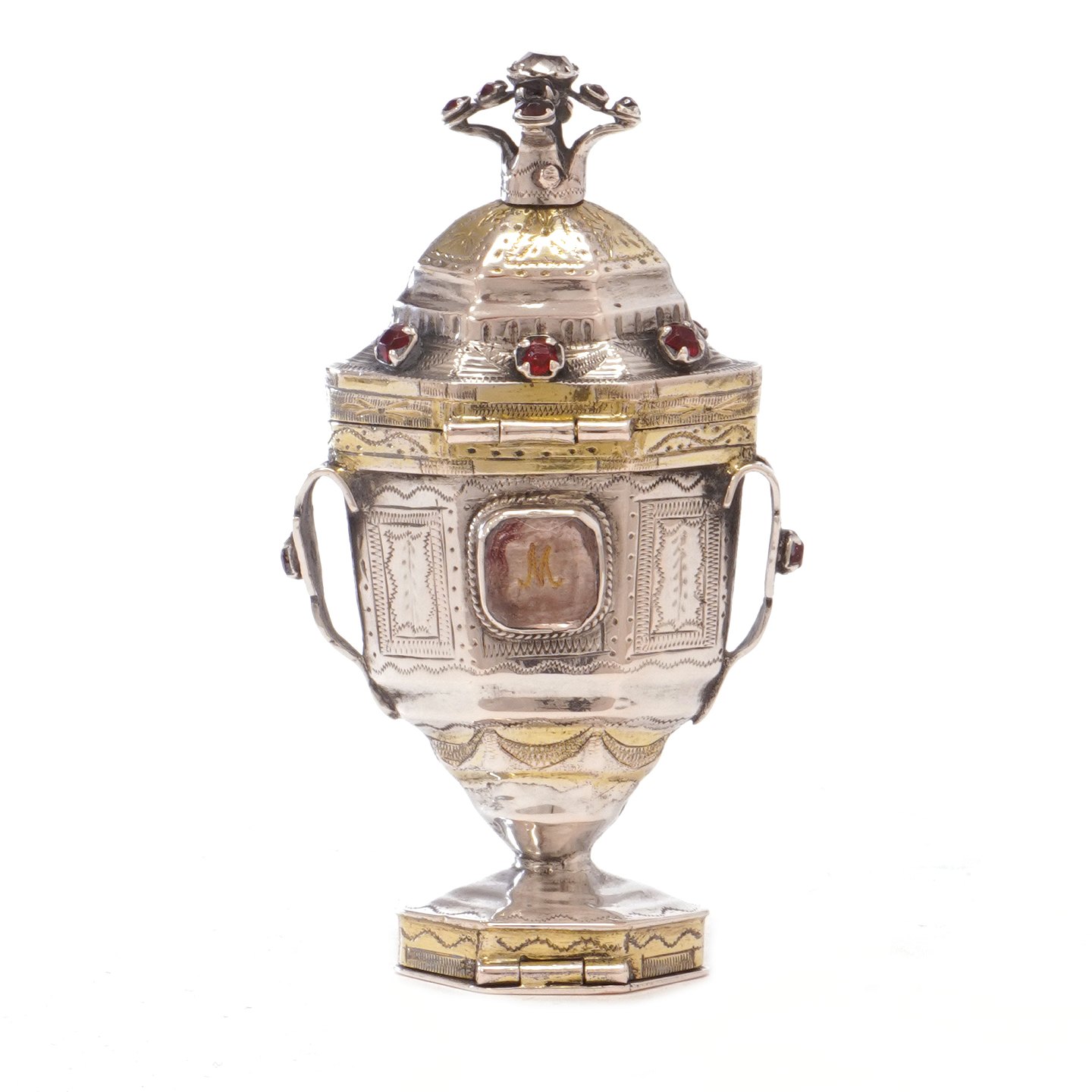 Hovedvandsæg i delvist forgyldt sølv udført af Martin Petersen Hommelhoff, Tønder, ca. år 1820. H: 9,5cm |