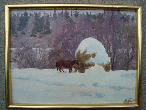 Maleri af russisk kunstner Vitaly Borovik - Vinterlandskab med hest 1992.