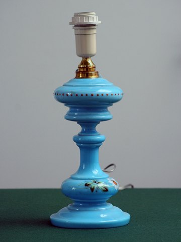 Turkis opaline petroleumslampe. Ændret til elektricitet. Højde 38 cm.