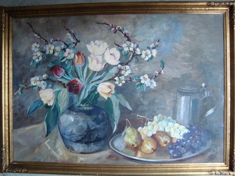 Opstilling - "Stilleben" - Kinesisk bojan med tulipaner og blomstrende gren, tinkrus og tinfad med druer og pærer.