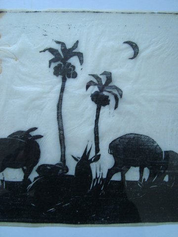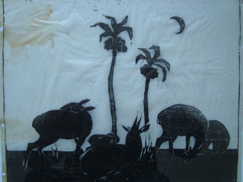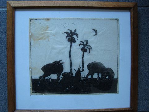 Træsnit på japanpapir af Axel Salto - Antiloper og palmer.