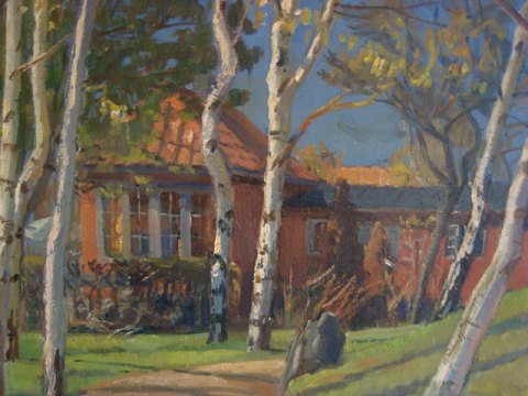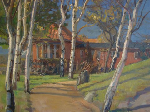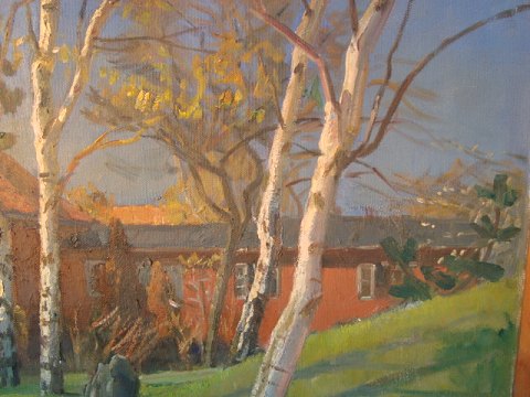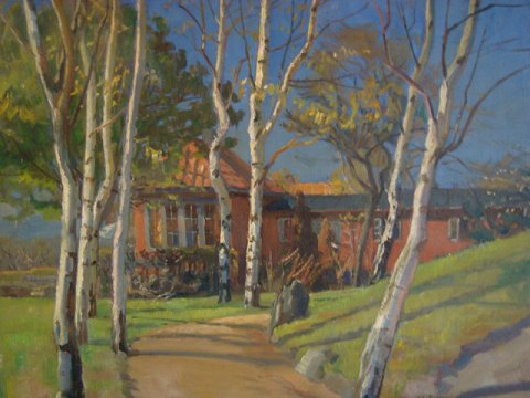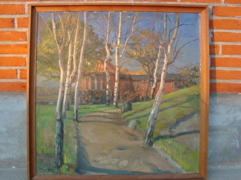 Stort smukt maleri med vej op mod hus - Carl J. Christensen 1940.