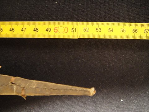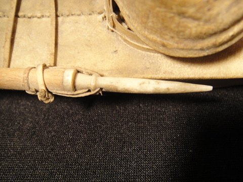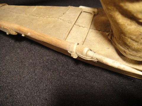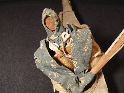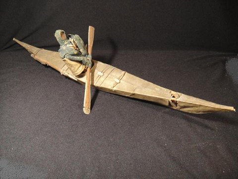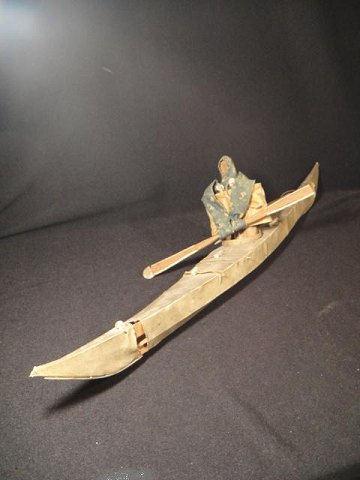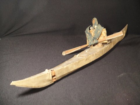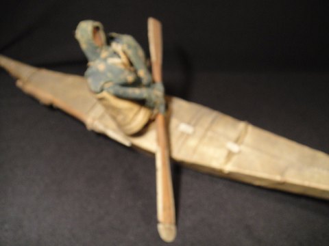 Grønlandsk kajak. med fangstredskab. lavet af træ, skind og ben. Længde 52 cm.