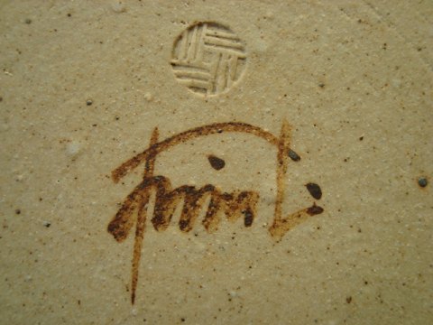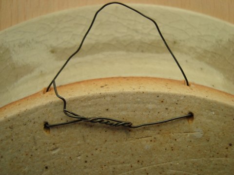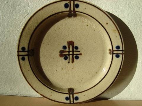 Ecru/grå fond med brun stregdekoration og blå polkadots.