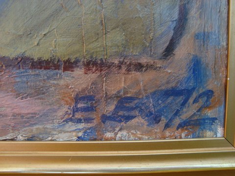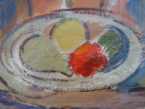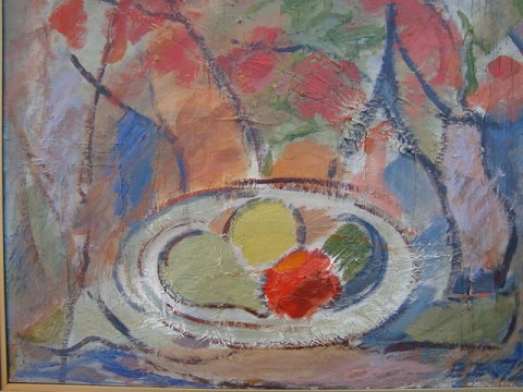 Maleri af Erling Enger - Opstilling med frugtfad og blomster 1972.