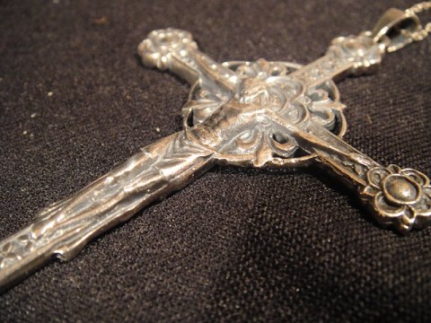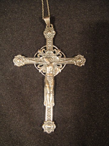 Large silver krysefix. with jesus on one side and maria and child on the other side.